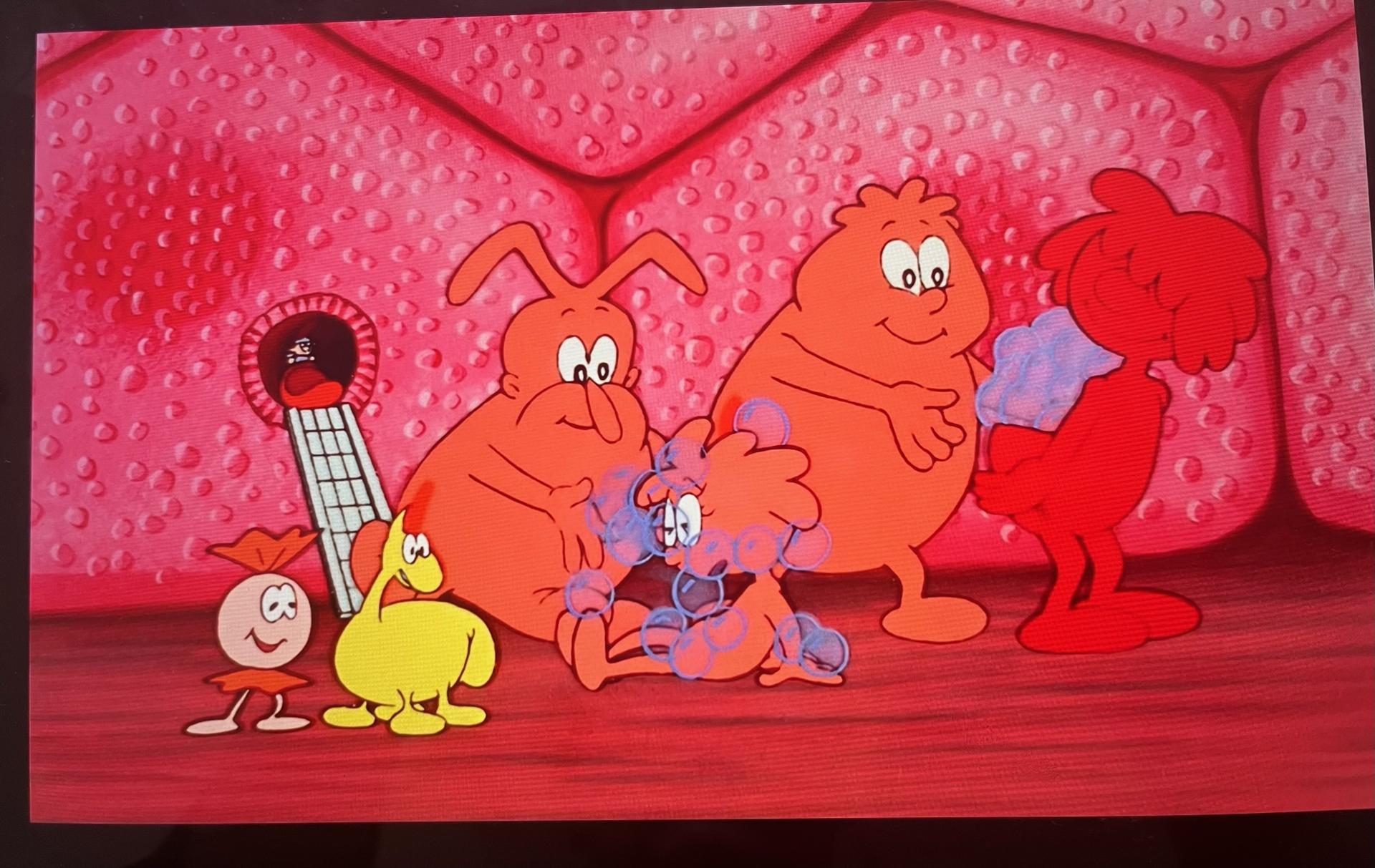 The cartoon, intended for an audience of children and adults, illustrates, with the help of animated characters, the structure and functions of the human body, using anthropomorphic figures to represent its microscopic components, from white blood cells to vitamins, via DNA components. There human characters are children who ask their parents or grandparents for information; and each of them has a "microscopic" alter ego that represents an element of the anatomy.