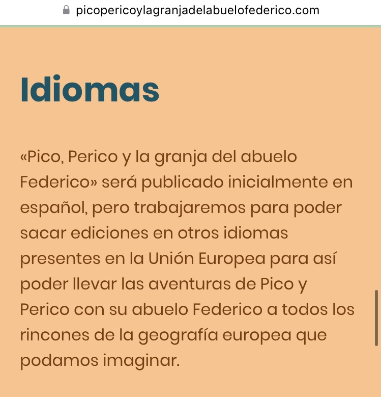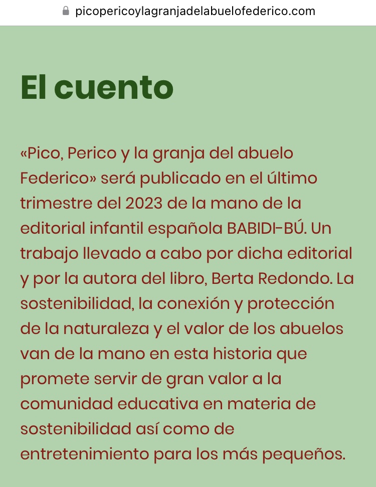 The purpose of this project is to transfer to the little ones the value of sustainability, the concepts of the green deal, the circular economy, fair trade, the importance of preserving the environment. All this through a story that will have careful illustrations, educational resources that will include complementary activities, educational games and storytelling activities. The project will be offered to educational centers and Spanish Public Administrations and the publication can be purchased in bookstores. We also have a website, www.picopericoylagranjadelabuelofederico.com, where these complementary activities and didactic games can be obtained once the book is published in the third quarter of 2023, which will establish the concepts learned in reading the story. The language of the story and educational resources will initially be Spanish but the idea is to also publish it in other coexisting languages of the European Union.