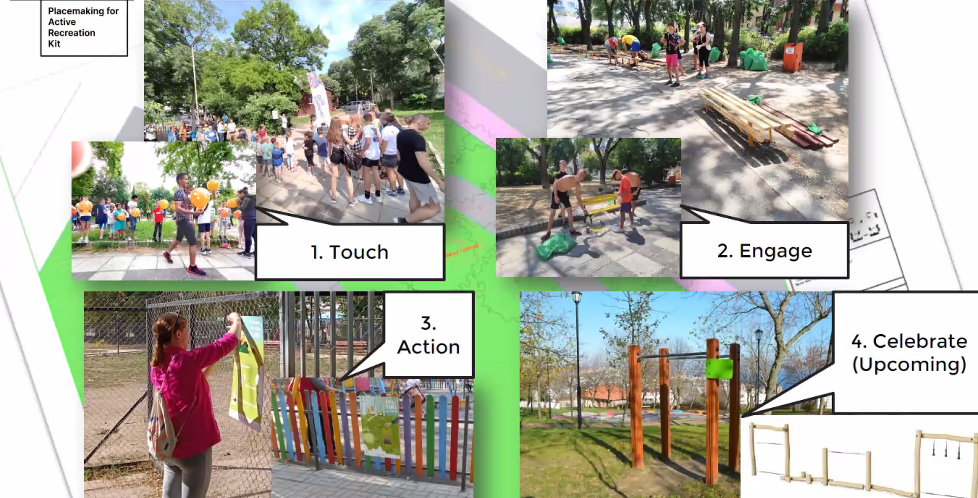 - We created the “Placemaking for Active Recreation Kit - containing - a research paper, а defined approach, collection of placemaking tools, policy and practical recommendations, and a free e-learning course. All of the resources are shared on an online platform and widely disseminated through the networks of Placemaking Europe and the International Sport and Culture Association;