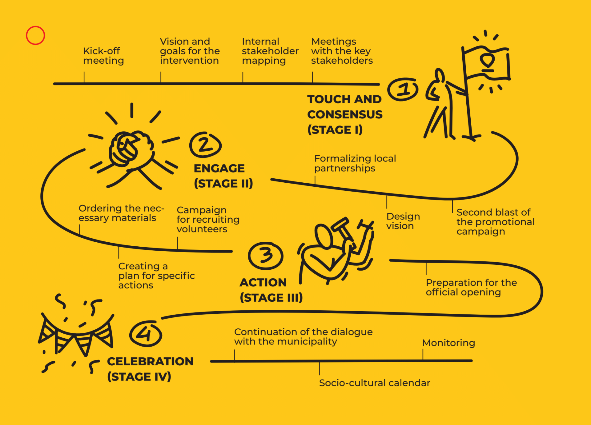 The "planning for people" approach, also known as placemaking, is a bottom-up approach to planning that prioritizes the needs, talents and ideas of local communities. This approach is in contrast to the traditional "project-oriented" approach, which is top-down and often ignores the concerns of local residents. The methodology of placemaking used in this project is based on civic engagement, which means that citizens are involved in the planning process as major stakeholders. The civic engagement process generated new ideas for interventions and invited people to reflect on their surrounding areas in order to plan for more physical activity. These interventions will serve as guidelines for other organizations on a local and national level on how to implement the toolbox, ensuring that the project's impact can be replicated in other cities.