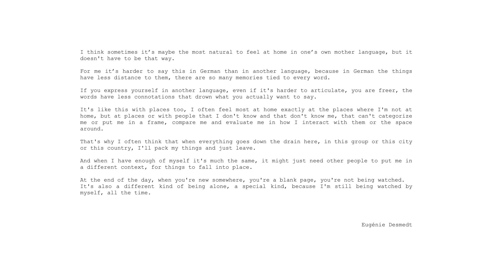 “Places we love exist only in us” is the opening sentence in a poem by Ivan V. Lalic. This video series is a project where I ask different people to tell their stories about belonging. Every episode contains 3 art workers of younger generations having creative control over how they want to be filmed, where, and what they want to speak about.