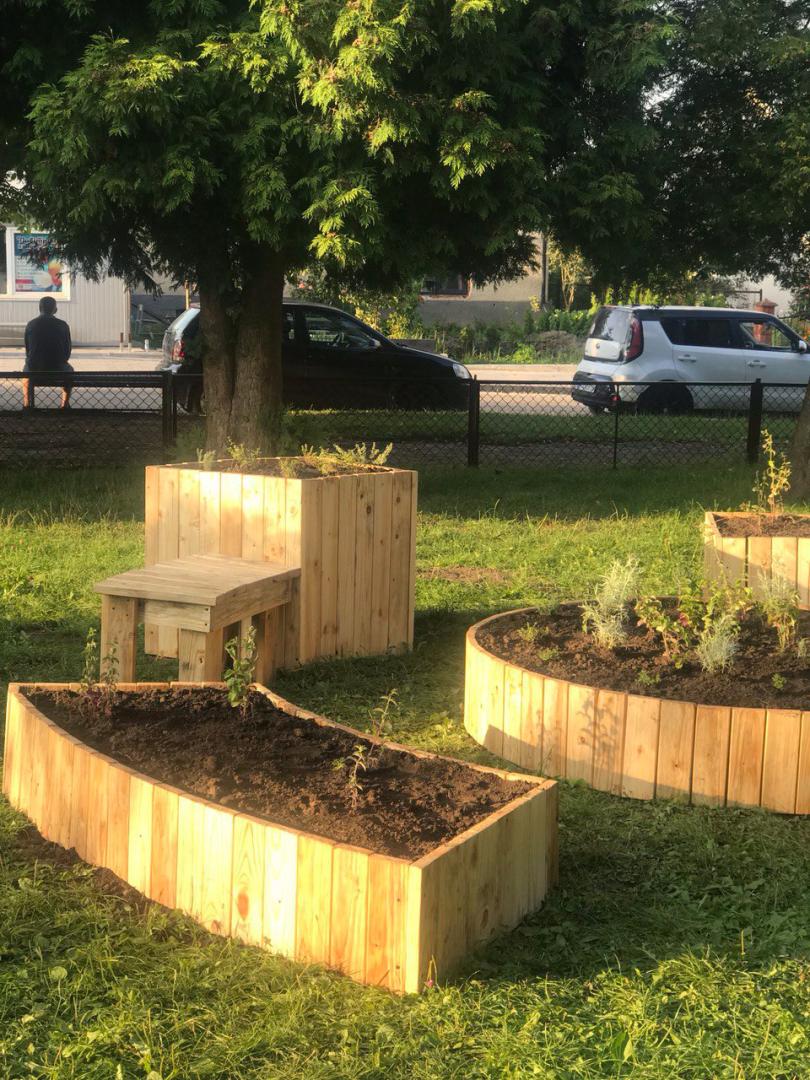 The modular structure of vertical beds and learning zones in the garden-farm of Rudkivska community. Not only can the elements replace each other, but such a garden-farm can also be easily placed on both smaller and larger territories.
