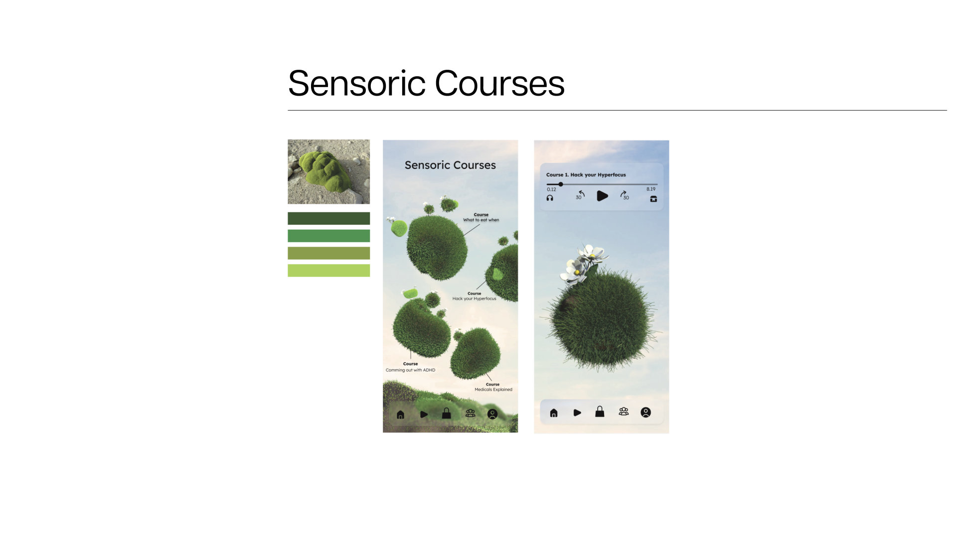 In the analysis the project saw the potential in learning about ADHD in alternative ways. The final design proposal of this project will thereby be retaining written material and moving into more tangible ways of receiving information. The solution aims to use senses, visuals, audio and touch in order to create an interactive space that is customized for users with ADHD. The Sensoric Courses will be hosted by experts within the field, taking place in an intuitive digital space.