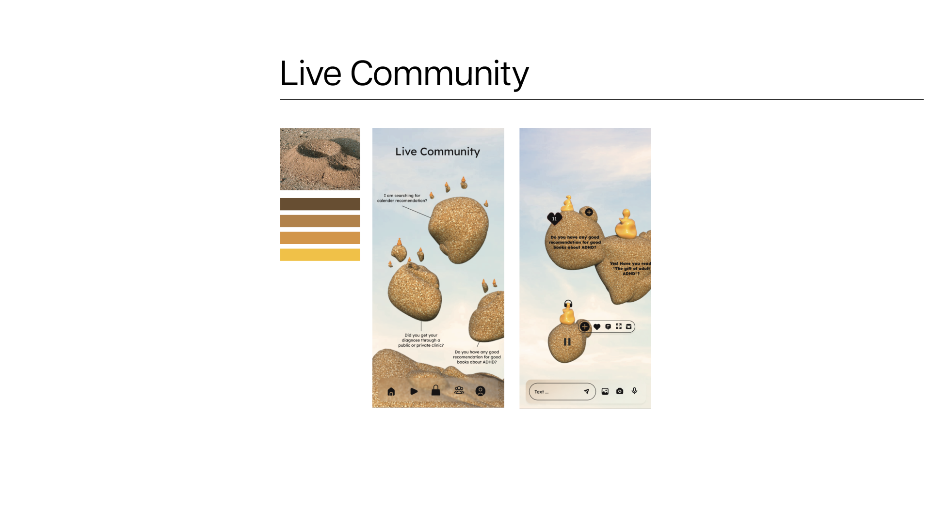 The universe of Planet a is an uplifting space based on 3D nature and hyperreal design. The peer to peer support and the opportunity to learn from lived experiences takes place in an interactive and immersive platform that takes the user far away from the conventional platforms of gaining information about ADHD.