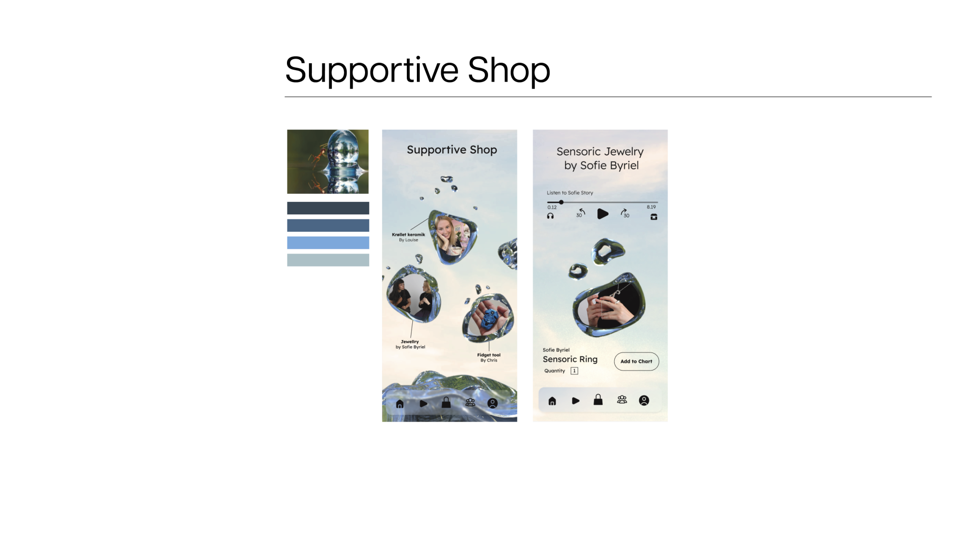 Lo-fi prototyping is a term for low-fidelity production such as rough and rapid sketches used to quickly get an overview of the user experience in the app. The rough sketching allowed the project to accommodate the functions of Sensoric Courses, Live Community and Supportive Shop in correlation to the creative direction. This rough mock-up method was crucial for the project to make the brainstorming process tangible and as a communication tool within the group.