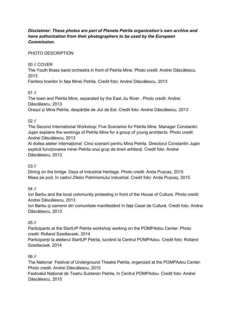 -Local initiative started as a bottom-up movement, which ended up being multi-level: actively supported by local (City/County Council – involved in the Masterplan &related studies, Petrila General Urban Plan&mine’s assets purchase from Ministry of Energy)&national public authorities (Ministry of Investments and European Projects, Ministry of Culture, Ministry of Energy, National Committee for Historic Monuments), acclaimed by Ep. institutions (Elisa Ferreira – Ep. Commissioner for Regional Policy)&supported by global bodies (World Bank).