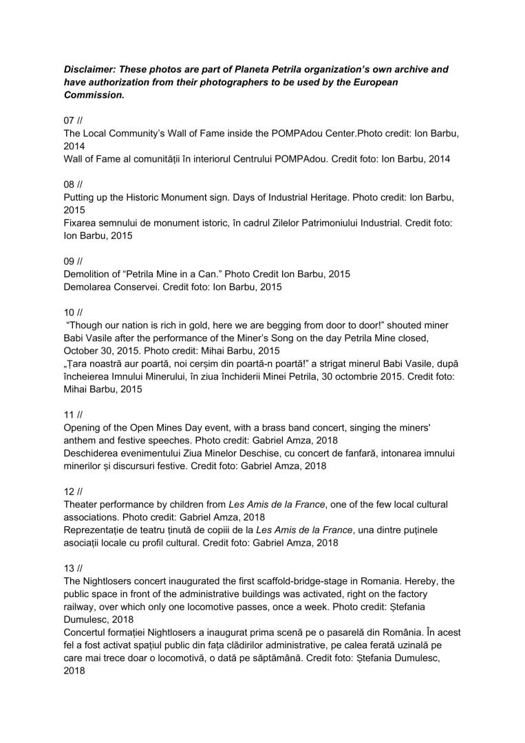 Events for attracting citizens in co-creation processes, by repurposing old mining spaces towards positive intergenerational exchanges&community-building: National Underground Theater Festival, Days of Industrial Heritage, Concerts (Nightlosers Concert - first concert on a railway footbridge in Romania), Night of Open Galleries, Classic Unlimited (classic music concerts in the former mine), Interplanetary Festival of Theater & Underground Circus, Present! (reading tent at the mine), Fridays for Future: mine planting of over 300 seedlings