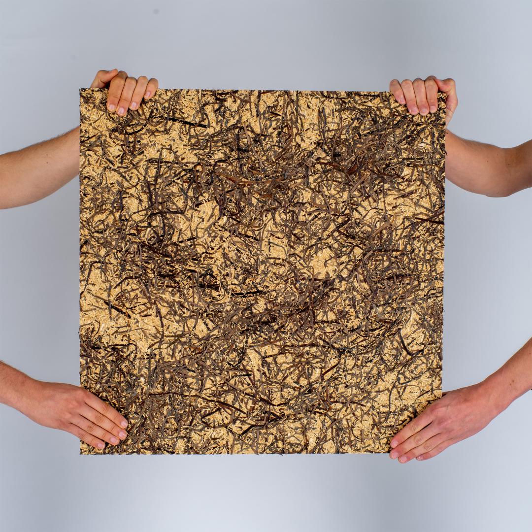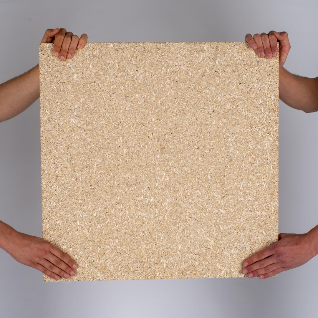 In addition, we offer customization of the starting materials of our panel materials. This makes it possible to tailor the use of materials to the project and create a direct emotional connection. An example is a fish restaurant that can realize an authentic interior design with a mixture of seaweed. Or let's think of a cafe that can create a holistic experience for guests with kakoa and coffee plates.