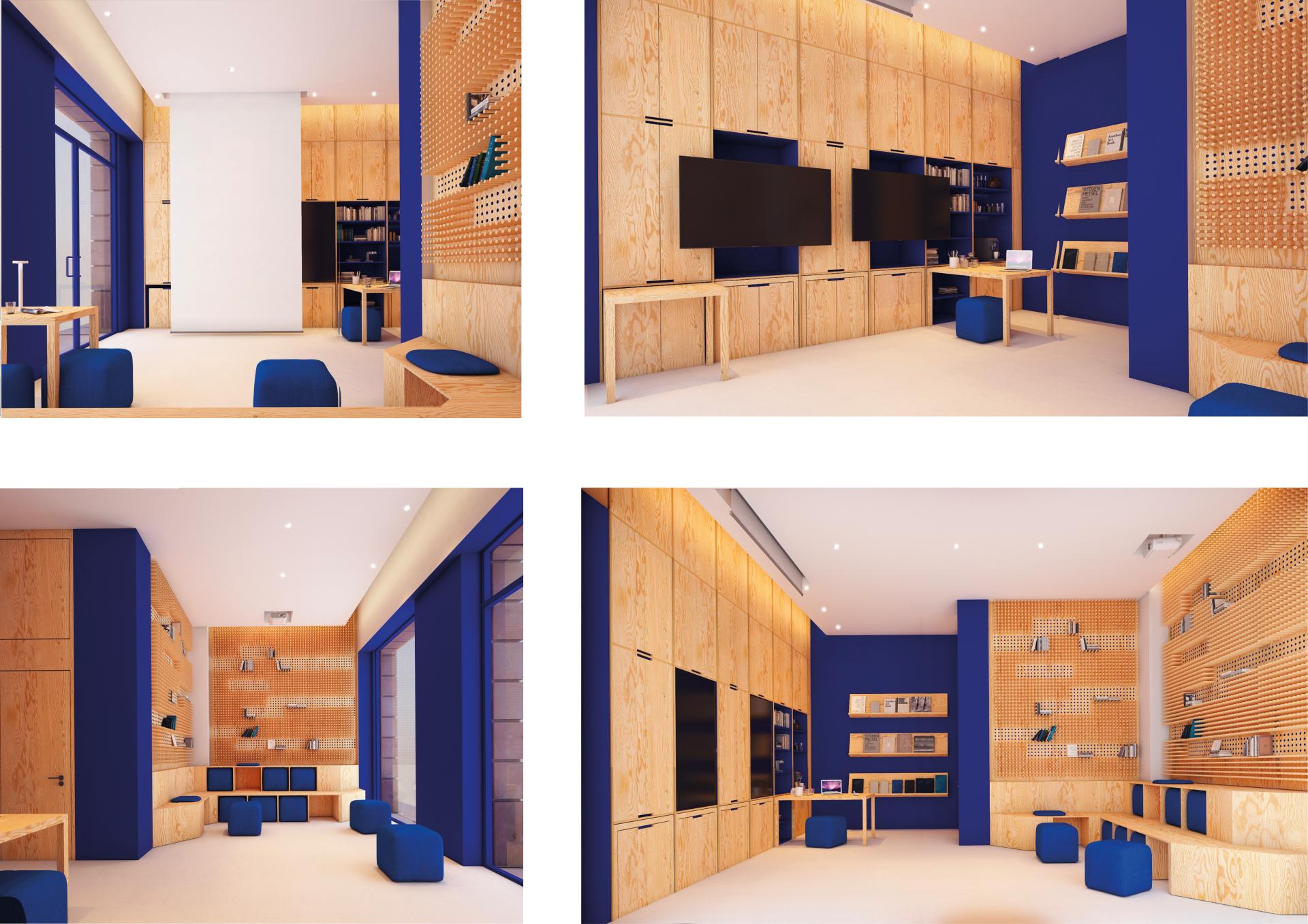 Aesthetic Appeal: The project prioritizes visual aesthetics, using bold colors, organic materials like plywood, and a dynamic color scheme to create a lively and attractive atmosphere.