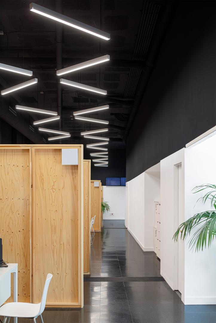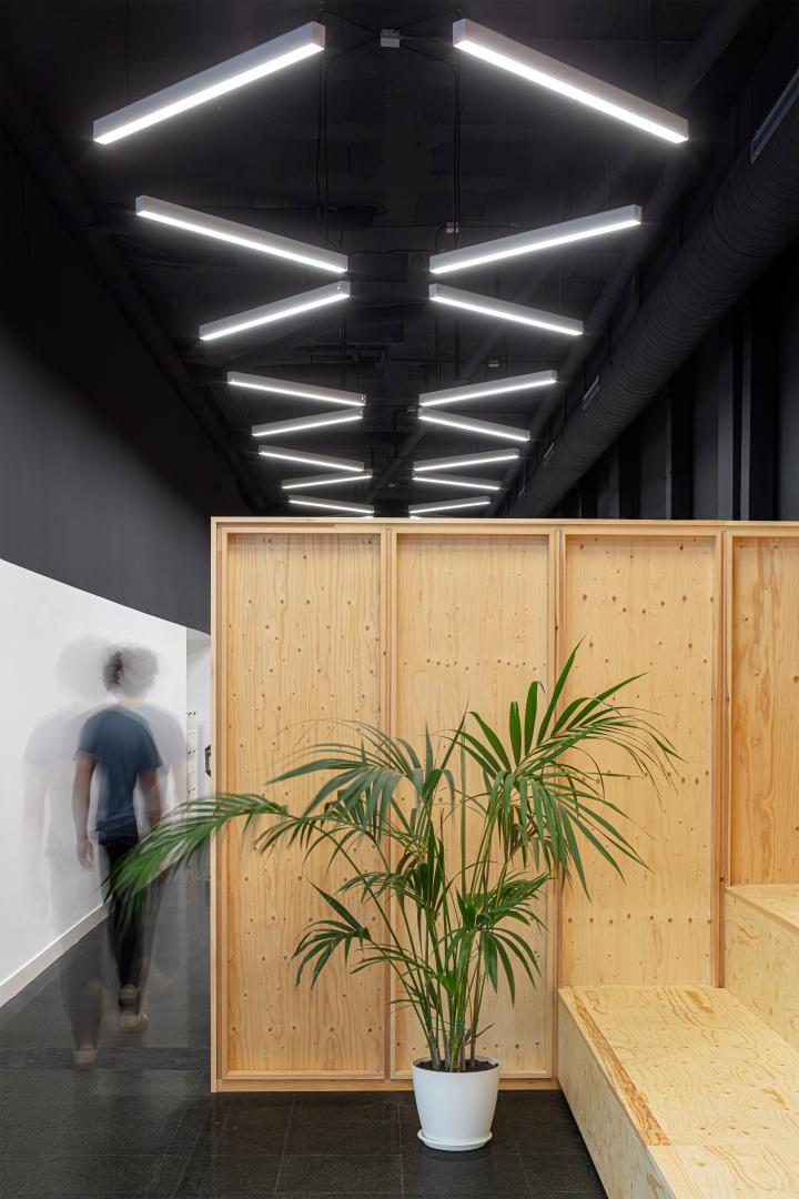 The low height of the partitions and it's warm-colored and minimalistic materiality tame the space. This diminishes the space perception scale and creates a leisurely sense of well-being to the visitors. In contrast, the lights generate a continuous, abstract pattern that defines a new virtual plane of the space.
