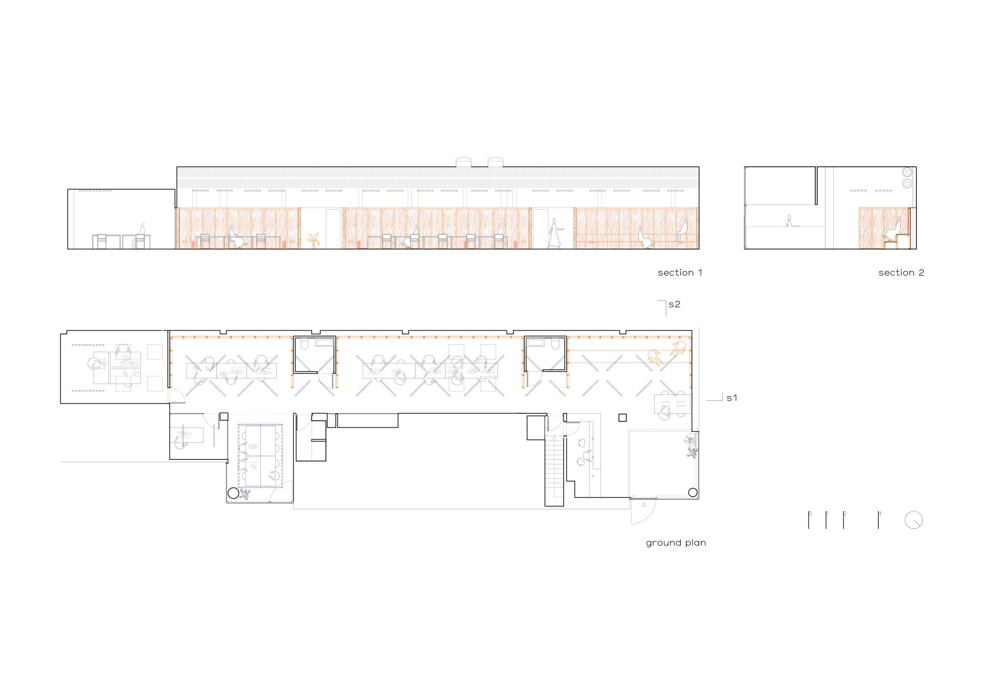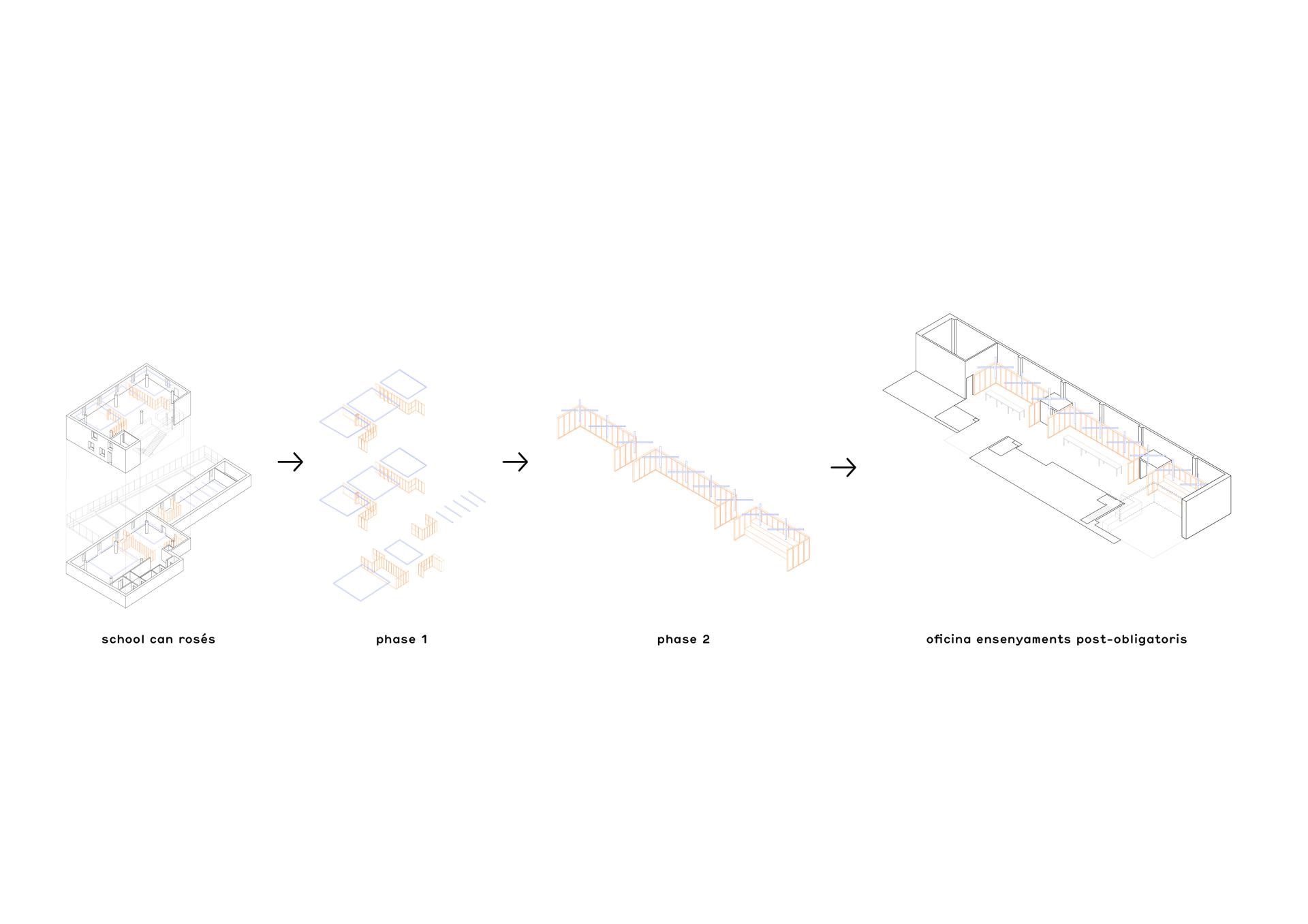 Another aspect addressed by the regional administration was the vacancy of establishments all over Barcelona. By using existing space instead of building a new office in form of prefabricated container-buildings, the aim for a quick renovation was supported. Nevertheless, as soon as the new space was available, it was clear that some kind of distribution is necessary. Since the client not only manages the Post-Compulsory Education Office but also the Can Rosés School, the decision to reuse the materiality of that project became obvious and solved another criteria in terms of a sustainable execution.