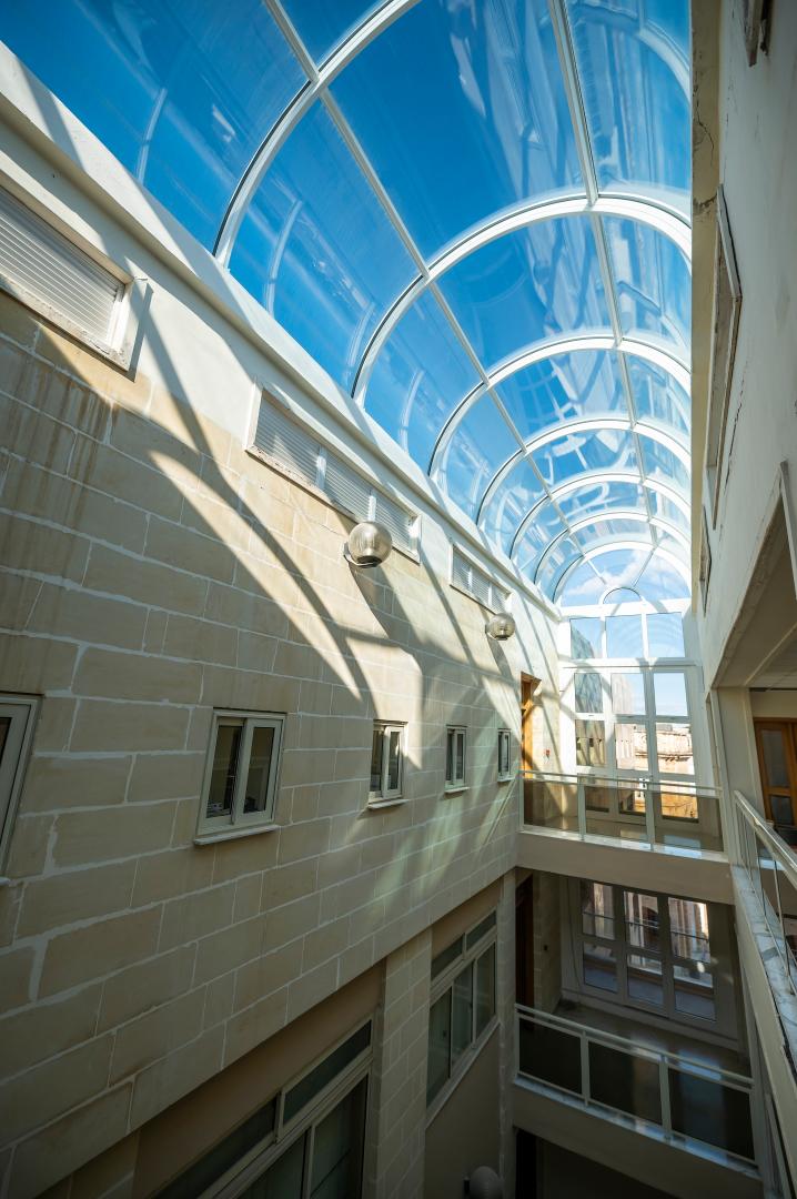 The energy performance upgrade of the building was specifically one of the aims of the project, an endeavor not much considered before especially for local public buildings. The external building fabric was tackled as a whole and special attention was taken in detailing to minimize thermal bridges. Apart from wall insulation, a less common measure was adopted ie, a cladding system with ventilated cavity using local material (hardstone from Gozo). This cavity brought about the necessity of fire safety precautions thus the requirement for fire rated insulation boards and a fire barrier system consisting of horizontal and vertical barriers. Research in this field was essential since it is not much in use locally. Double glazed apertures were procured with aluminium frames having thermal break ie. a continuous barrier between the inside and outside parts of the frames, that reduces to a great extent the amount of heat transferred through the frames. The atrium skylight being semi-circular in section with curved double glazing, posed another challenge for its manufacture. The same goes with external louvres which were specified with manual operation instead of sensors to reduce future maintenance. Locally, fixed external louvres are the norm. Also, this project was the first to install BIPVs on the facades of a public building in Malta. BIPV panels provided an eco-friendly and innovative aspect to the overall look of the building. The installation of BMS (Building Management System) gave a more rounded design and effectively formed the link between architecture, services and management
