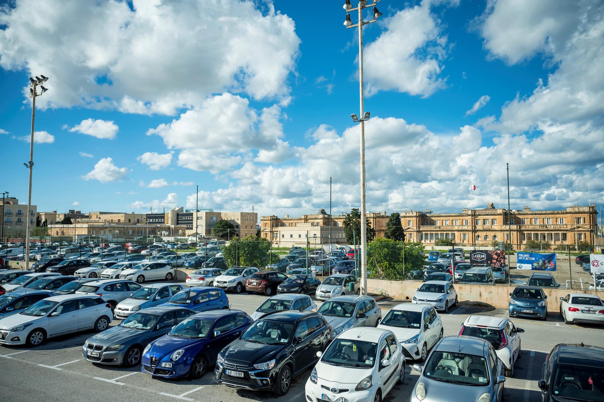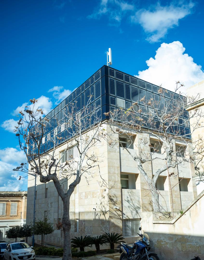 Building integrated photovoltaics (BIPVs) were installed on the upper parts of the southeast and southwest facades ie. elevations receiving most sunlight, for maximum effectiveness. These facades are not visible from Marsamxett harbour down below, hence no adverse impacts on the underlying historical bastions system. The mounted BIPVs are of the transparent glass module types such that stone cladding is visible through the glass between the cells. Viewing from Triq il-Mall in Floriana, the dark colour of the cells amalgamates with the dark green of nearby trees.