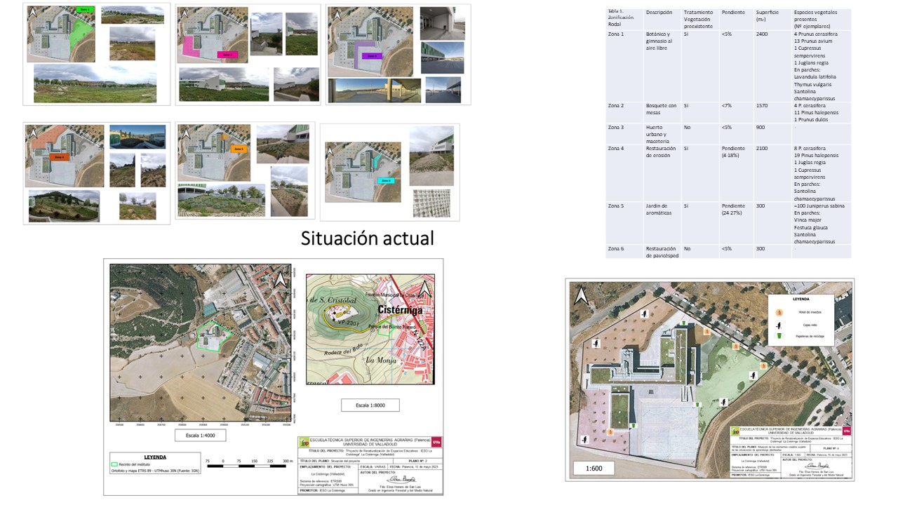 The project is my final degree project in Forestry and Natural Environment Engineering at the HIGHER TECHNICAL SCHOOL OF AGRICULTURAL ENGINEERING of Palencia. Titled “Project for the renaturalization of educational spaces: IESO La Cistérniga” La Cistérniga (Valladolid).The actions proposed are intended to naturalize the educational center's facilities to allow their use and be useful, at an educational and ecological level, in addition to facilitating their integration more effectively in the daily activities of the center.The target groups of the project: students of the educational center, teachers and other staff, all members of the locality as beneficiaries of the actions carried out there, society in general as it represents an environmental improvement initiative. Within the specific objectives, two main blocks can be distinguished, on the one hand, those related to the improvement of the physical environment and on the other hand, those related to the integration of the environment in the center's teaching.To improve the environment, there are objectives such as soil improvement, the implementation of a stable and appropriate plant cover for the area or the restoration of the grass, managing to mitigate the effects of erosion in the most inclined areas, reducing surface runoff and favoring soil retention and infiltration. Prioritizing the use of native species. fight against climate change, creating green spaces as a carbon sink, fixing part of this element in the soil, where plants use it and its concentration in the atmosphere is reduced, helping to alleviate the effects of this phenomenon. As a result, the integration of outdoor spaces in different subjects is sought, generating an improvement in the educational environment. The quality of learning improves with the approach to the natural environment and coexistence with it. It allows students to raise awareness about the importance of theenvironment, protection, focused on sustainability and resilience.