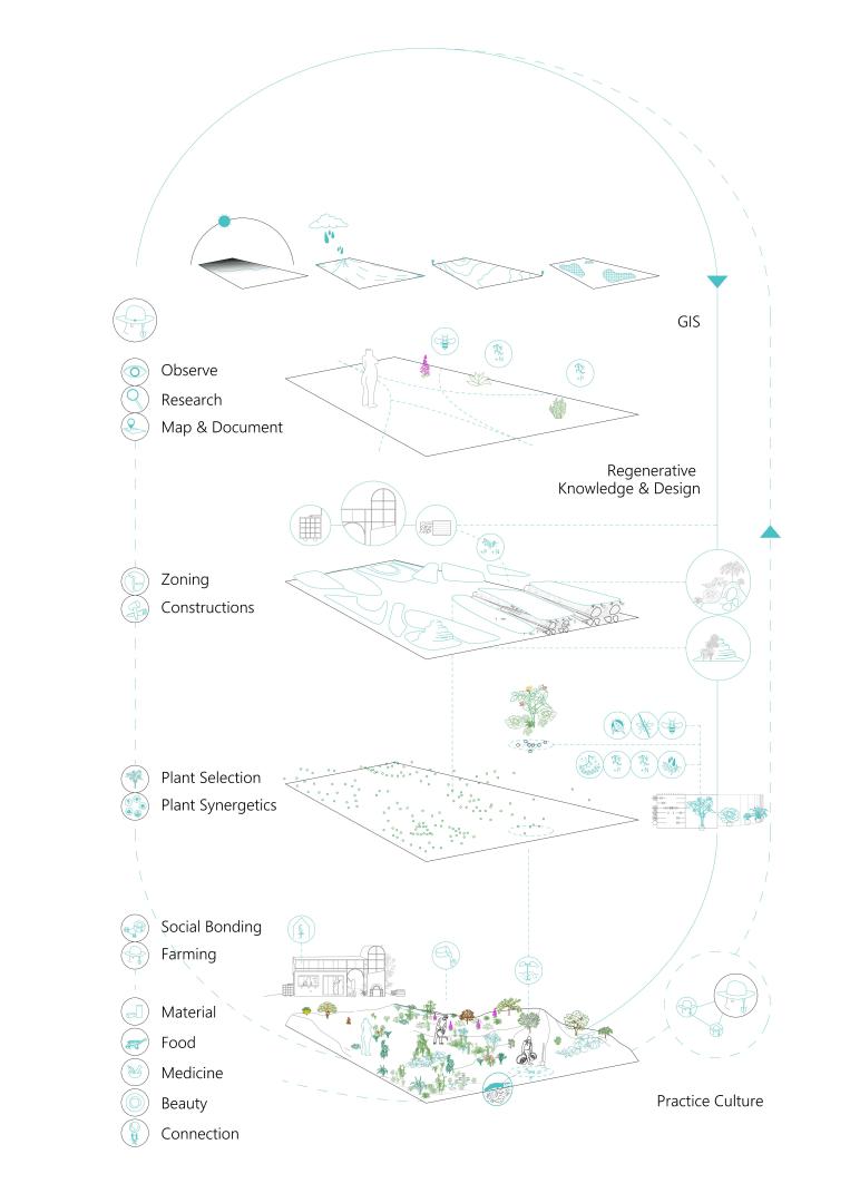 On a strategic planning level we aim to catalyze development with open-source strategy steps. Our database of edible and useful plants combines individual conditional data such as suitable climate, soil-types, companions and foes, growth and maintenance into strategies. For this we actively seek, collect and reference projects and relate research into a visually translated hard knowledge of regenerative practices. Plants can already be positioned and mapped with our early GIS mapping features.