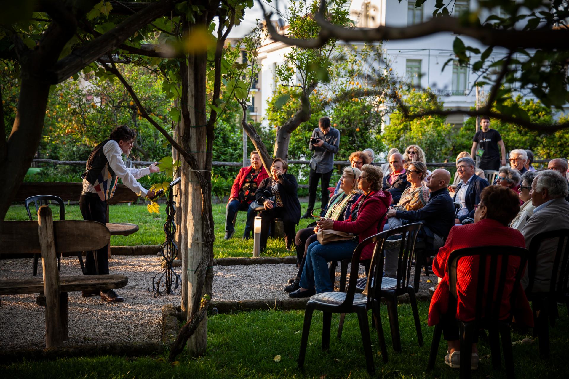 1) We give life to a dozen of theatrical site-specific performances, staged in open-air areas (botanical gardens, Italian gardens, terraces, meadows, woods, cloisters...) of several Heritage sites in Campania for ten days to create a multisensory aesthetic and artistic experience. It is a green festival, it is mainly realized without electronic equipment and/or artificial lights, each performance is immersed in the natural light of the sunset and the sound of the environment.