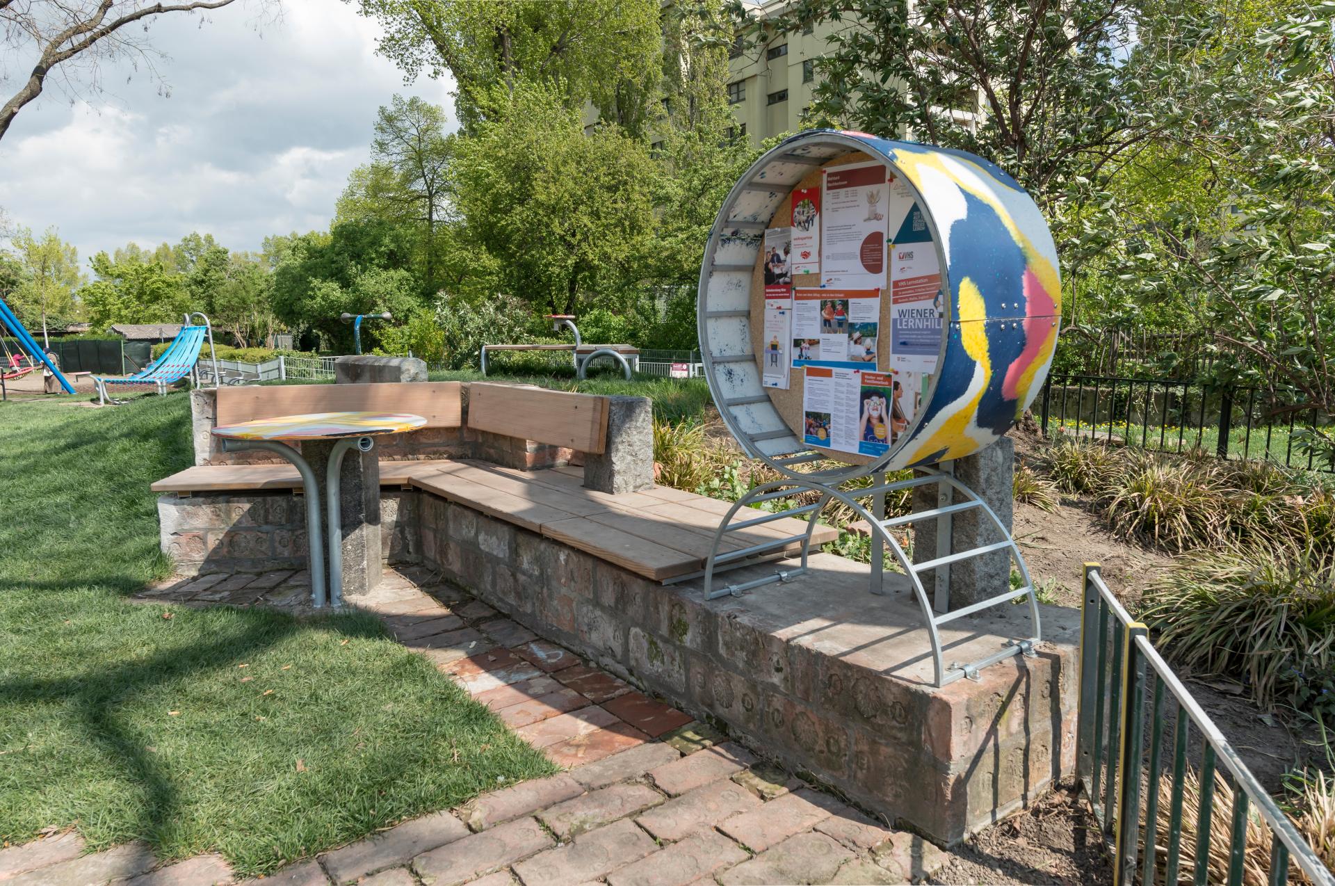 Building on a participatory process – revealing a strong desire for a park offering quality for everyone – the final redesign follows the principles of circular economy. All material resources derived from the former stock on site are recombined, re-used or recycled. In addition, "waste parts'' of the common park furniture installed by the Viennese municipality, currently accumulating in large quantities for disposal, were taken up as a valuable resource. A modular rethinking of the components results in a growing variety of sustainable urban furniture that the City of Vienna can use and maintain at low cost. Due to its open-source character, the project serves other cities as an exemplary strategy on how to narrow the circularity gap by detecting so far discarded materials and by promoting a socially sustainable way of (co-)creating public space.
