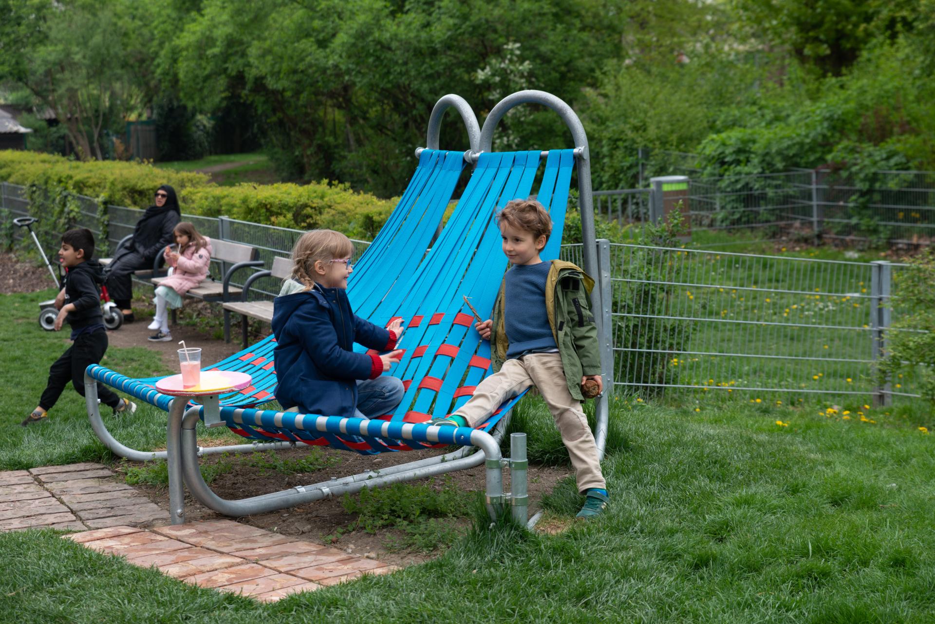 The project aimed to join bottom-up and top-down forces, as it requires interdisciplinary collaboration that looks beyond power relations and hierarchies to build resilient cities. The involvement of residents and local initiatives during the design and implementation phase of the park's redesign was core to generate a socially sustainable impact. In a first step, residents could contribute their suggestions, criticism and wishes at public workshops on site: How should the park be (re)designed to respond to the lack of social infrastructure in the area and what are specific needs (for urban furniture) of young and old? Participants were able to express themselves in various formats (conversations, drawings, writing, with objects/materials, models). The ideas collected were condensed into drafts for circular urban furniture that in turn were put up for public discussion and refined. Following an agonistic planning theory, which understands conflicts as an immanent part of a pluralistic democracy and accordingly as a motor for social change, the model of sociocracy formed the basis for the condensation process of the diversity of ideas. The outcomes informed the choice and design of the street furniture, which responds to concrete usage needs, e.g. a barrier-free Hollywood swing was implemented because many older people expressed the desire for something playful in public space.