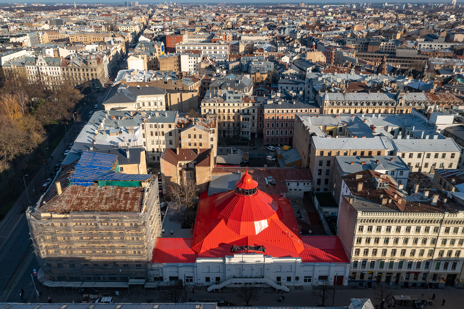 A. Solomonskis, the original owner and founder of Rigas Circus, was a horse trainer and circus artist whose profession influenced his attitude towards the construction process. Analysis of the historic building has revealed baseless walls, uninsulated roofs, and other unusual building techniques. For example, the 130 year–old arena stands proved to be a temporary construction built using repurposed timber. Continuing the tradition of unusual building techniques, NRJA has implemented a unique CLT panel dome that is capable of bearing both the constructive and workloads that are required from different performance scenarios.