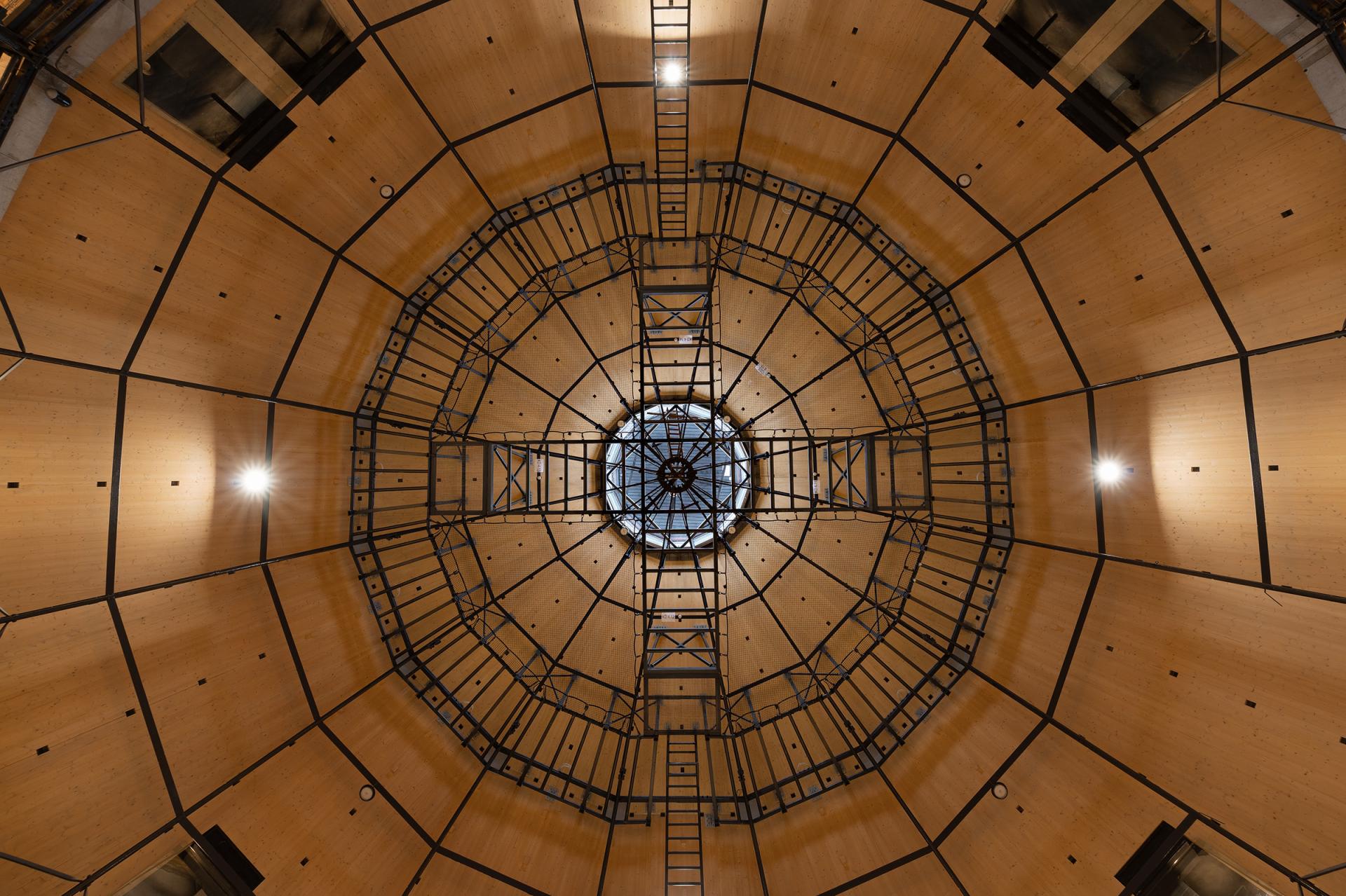 As the historic dome metal structure has lost its bearing capacity, a parallel construction of a new column network and CLT panel dome was built, keeping the historic structure unloaded and exposed. The CLT panels not only provide the structural stability, but also create a smooth, solid internal plane that does not require further finishing and improves energy efficiency significantly.