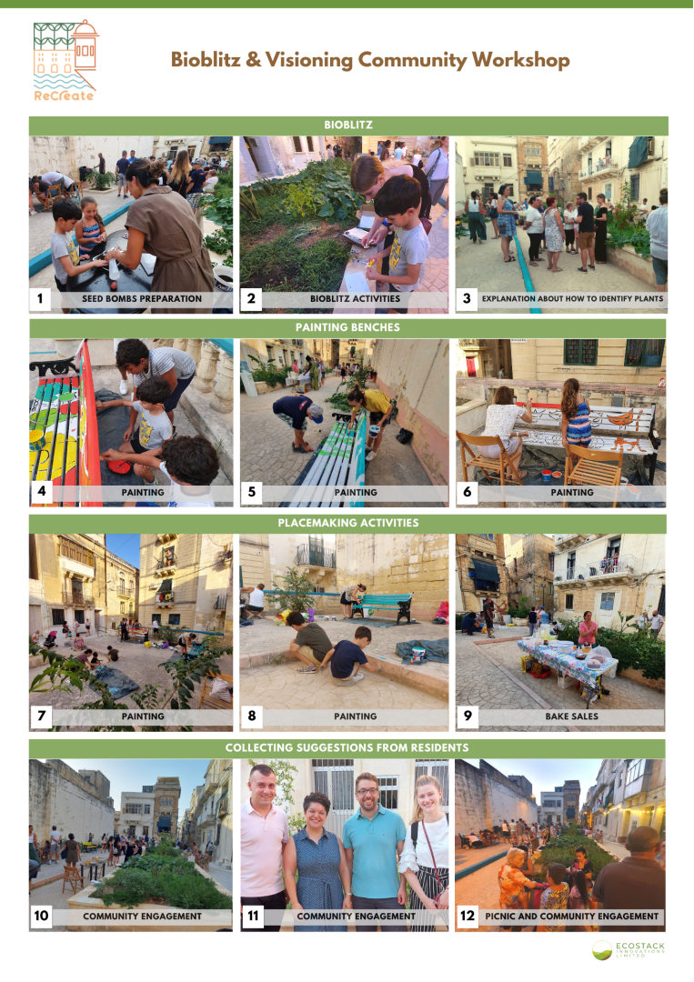 The locality of Senglea is at the heart of Malta's urban conurbation. It is a peninsula with a high-urban density (17,500/KM2), tight-knit community and with low access to green spaces (only 0.6% of the area is a green space). This is where ReCreate comes in to revitalise urban spaces, many of which are dilapidated or underutilised, by reconnecting communities to nature and through a participatory process that fostered interactions, learning, and co-creation action. Two locations in Senglea were selected (Senglea Waterfront and Misrah Andrea Debono), and actions were carried out through several events held on-site:
