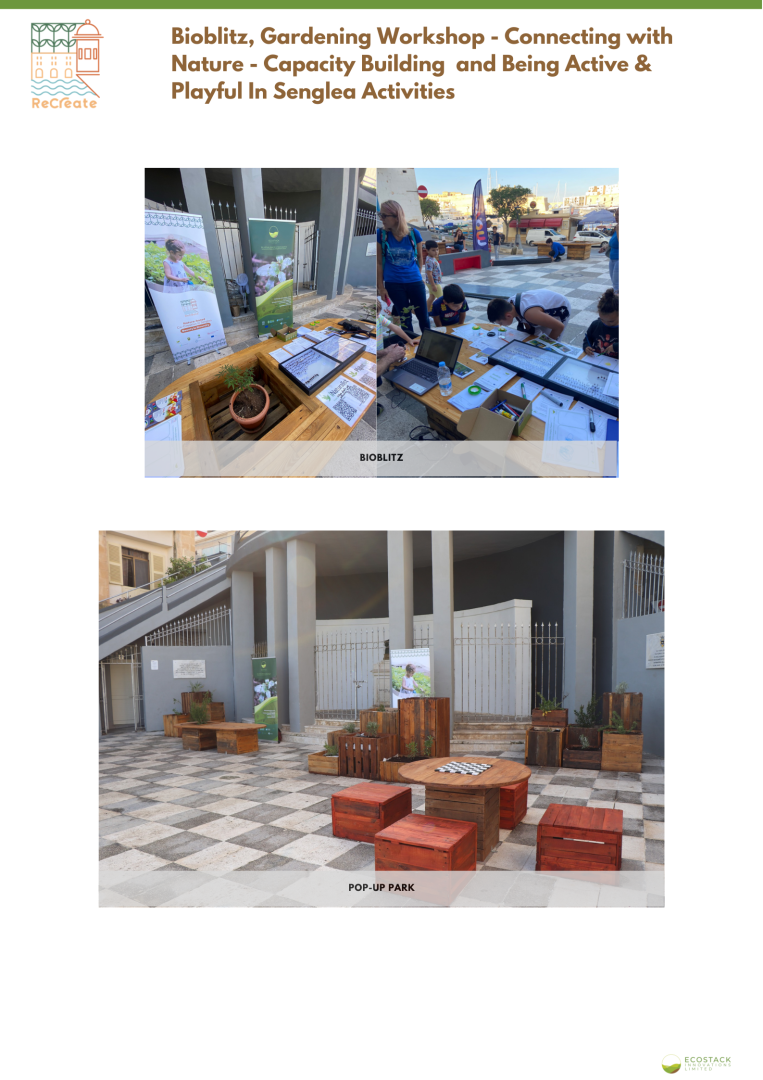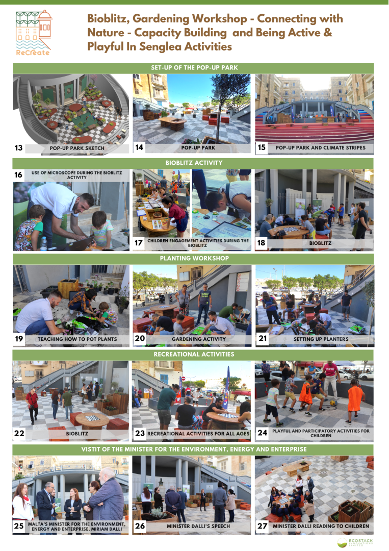 2.Being Active & Playful In Senglea activities (Figures 13-27): A second BioBlitz was held to explore urban biodiversity. In addition, a ‘pop-up park’ using temporary instalments of planting and street/play furniture was developed and launched near the historic Senglea Waterfront, the first of its kind in Malta. Indigenous species were planted, street games were held, and climate stripes were painted on the stairs surrounding the square to raise awareness about global warming.