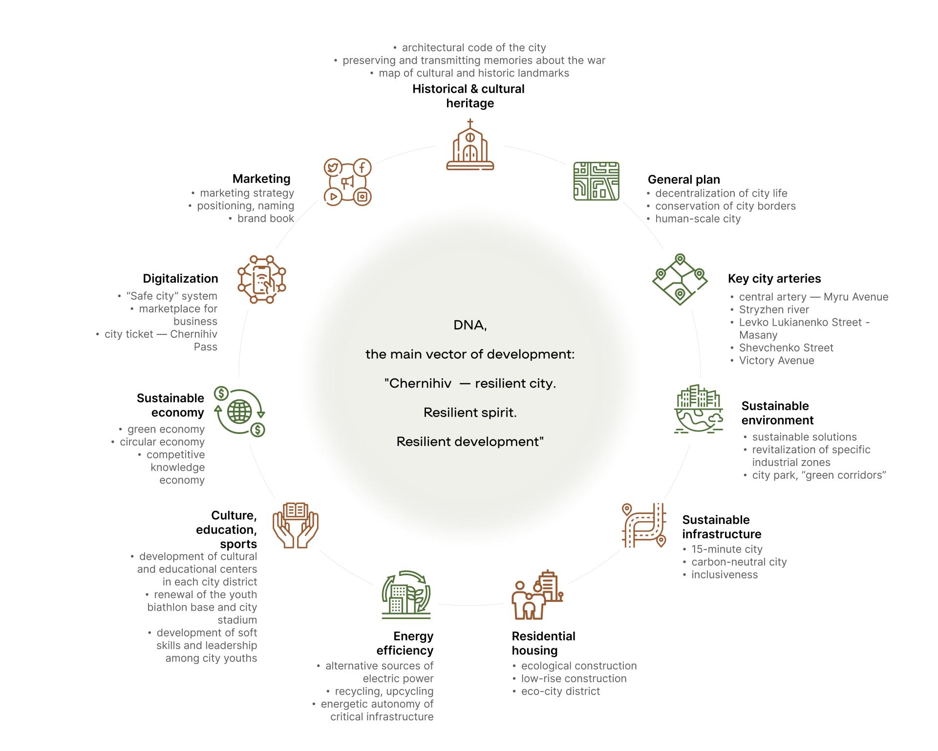 The concept is built on Chernihiv strengths - history, natural resources. Being 140 km far from Kyiv, 2 hours from the biggest airport with concept implementation, carefully planning appropriate investments in human capital, effective institutions, relevant technologies, and innovative and competitive enterprises, Chernihiv can not only succeed in competitive green rebuilding but develop even better than before.