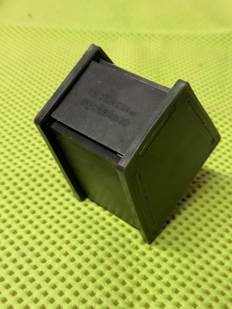 The design of the pen holder has been specifically tailored to fit the concept of Eco-design. Making the various constituent faces of the object composable eliminates the need for any adhesives, as the assembly relies on a "puzzle" fit.