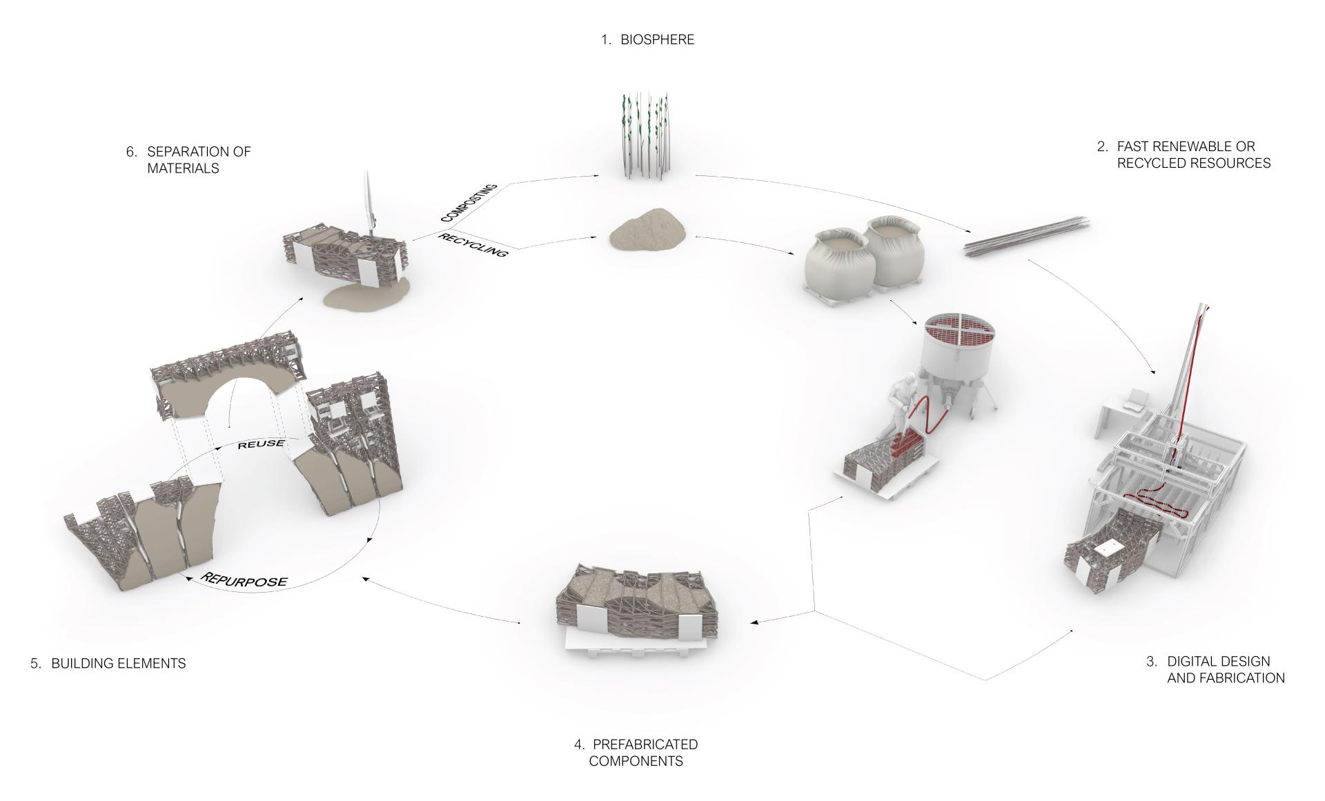 The underlying research of the project delves into the complete value chain, examining local sourcing and into which steps to take in order to create a sustainable, circular product for market applications that are both affordable and replicable.The project aims towards a short term reduction of emissions in construction and a long term perspective for circularity in sustainable architecture though fully recyclable and waste free construction.