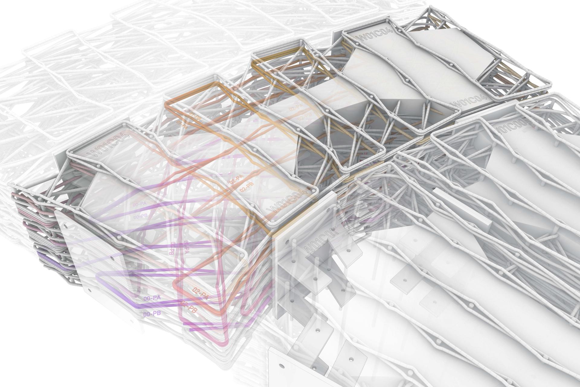 The design methodology prioritises the creation of a construction system through the development of its constituent parts, adopting a bottom-up approach. It explores an architectural language rooted in materiality and fabrication systems, leveraging the functional and intricate complexity achievable through digital design and fabrication. These digital workflows empower architects, engineers and users to experiment with diverse designs, adjusting them to meet specific goals while navigating the complexities of implementing an innovative construction method.