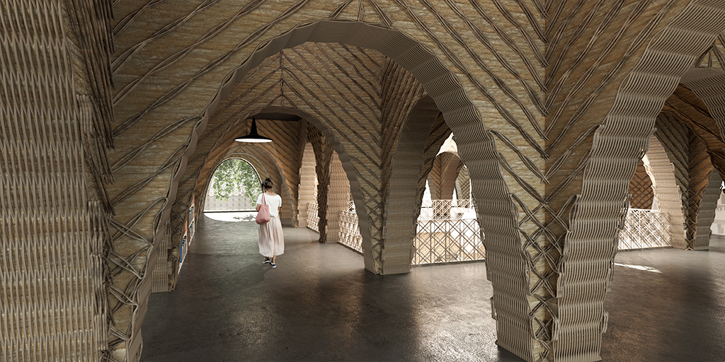 On another front, it involved the concurrent development of architectural design and research themes centered around microclimatic conditions, local energy harvesting, and feedback loops with the life cycle assessment of this innovative material system in order to inform the development of the overall construction system.