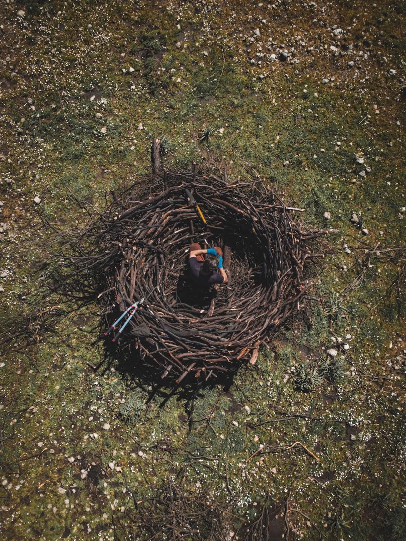 Moreover, by repurposing this wood, we erected grand nests as public installations aimed at instilling a newfound sense of belonging to nature. They were placed on a mountain route accessible to both pedestrians and mountain bikers that was created as part of the initiative. This feature not only breathes life back into the desolated terrain but accentuates the aesthetic quality of experience, harmonising design with the environment.
