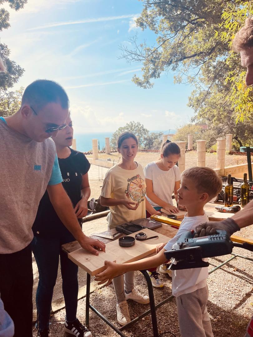 It is very attractive to people because we combine art and craft skills in our workshops. Vasilisa (12 years old) always demonstrates her ballet skills to us, while Alexije (4 years old) is interested in master crafts. Others are interested in skills such as smoothing wall surfaces, working with wood and glass, playing the piano, molding plastic, etc.
