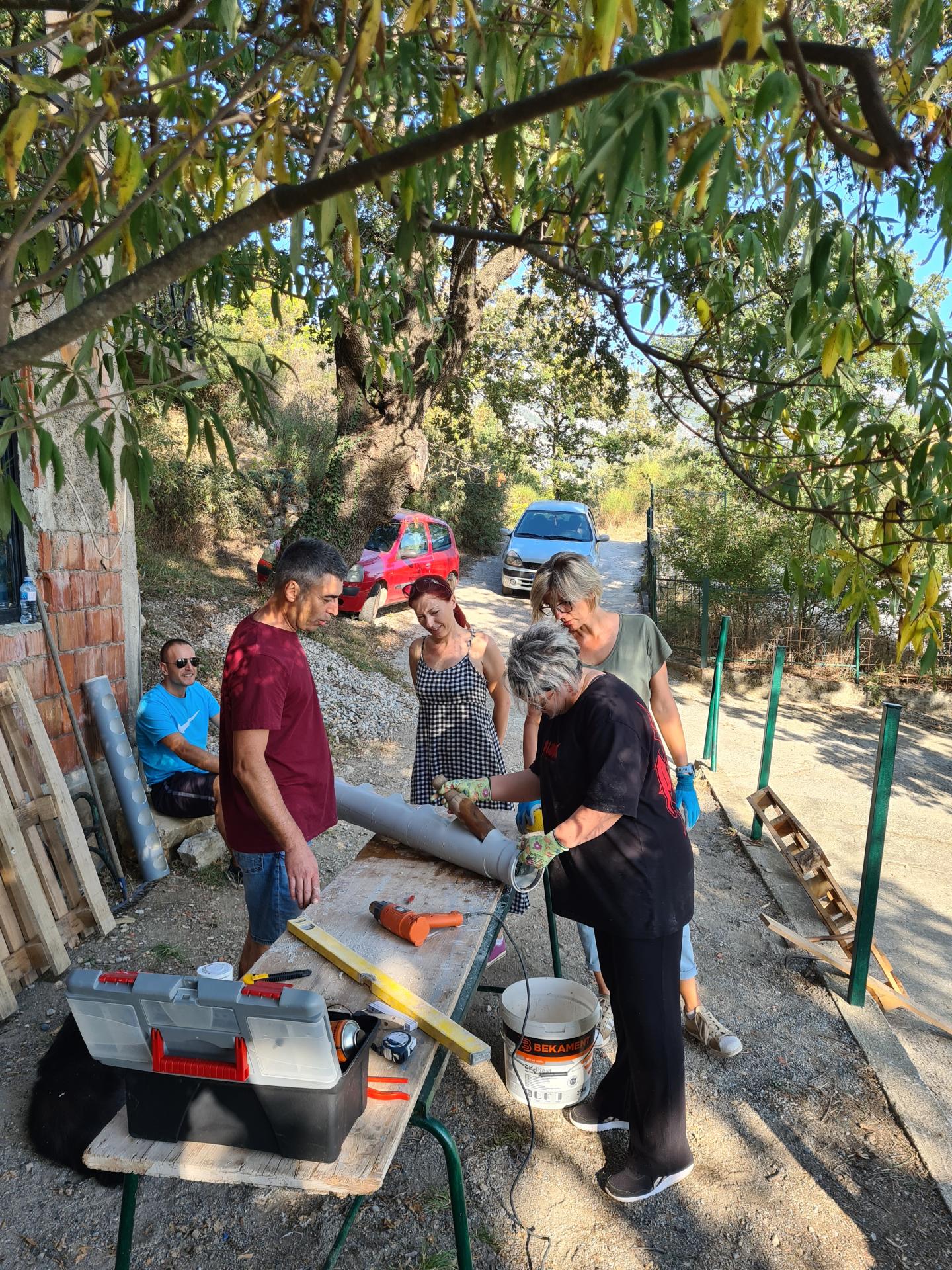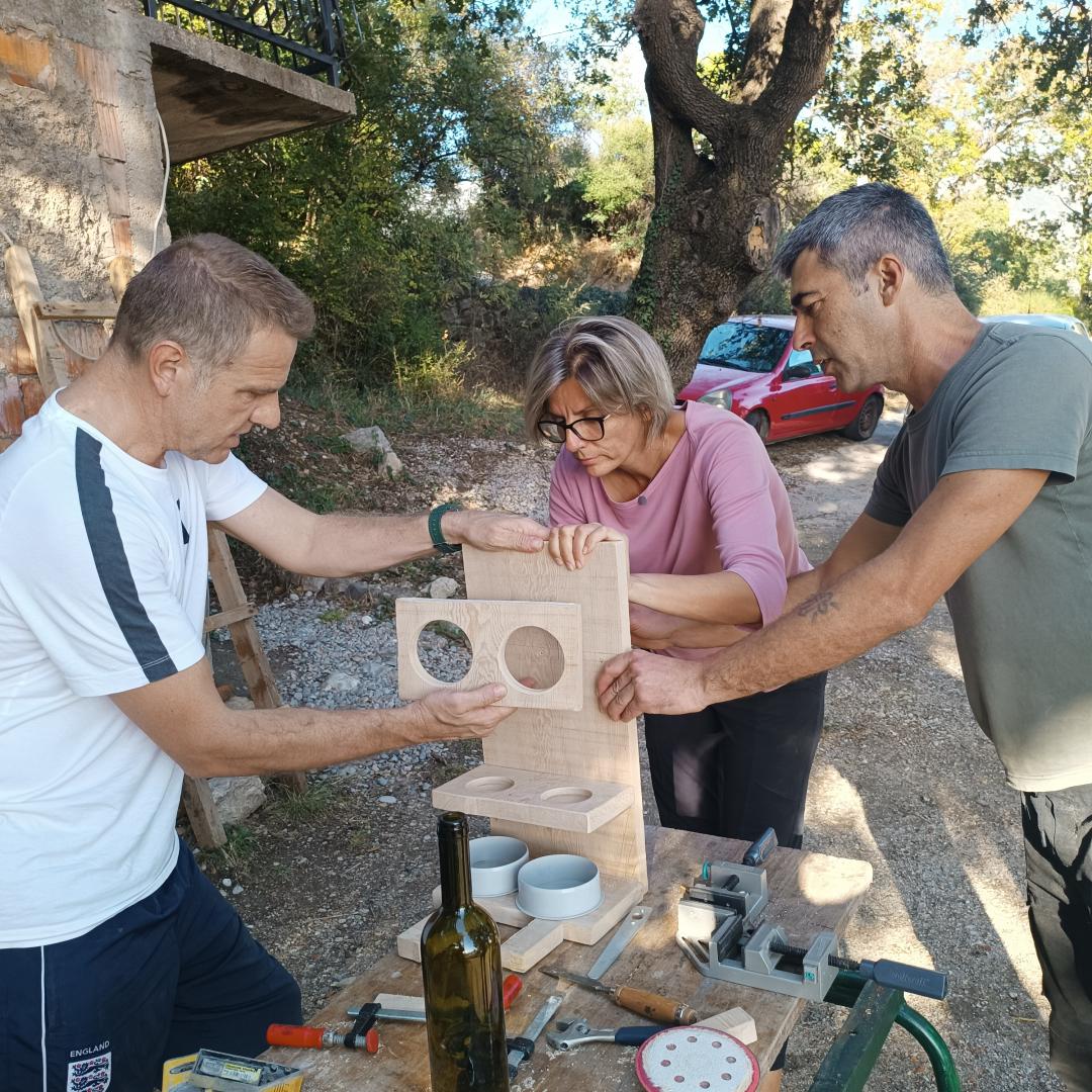 From 2 p.m. we had practical workshops and work with our hands. In this block of socializing, we learned some practical skills such as smoothing wall surfaces, working with wood, plastic, clay, glass, and we practically made insulation from sea grass, bird feeders, elements of vertical gardens, a bench for sitting, liquids for house hygiene maintenance, bokashi and regular compost, liquid fertilizers for plants, microbiological soil improver, plaster art, small-format land art, and we also started an organic garden, planted plants and cultivated indigenous fruit species.