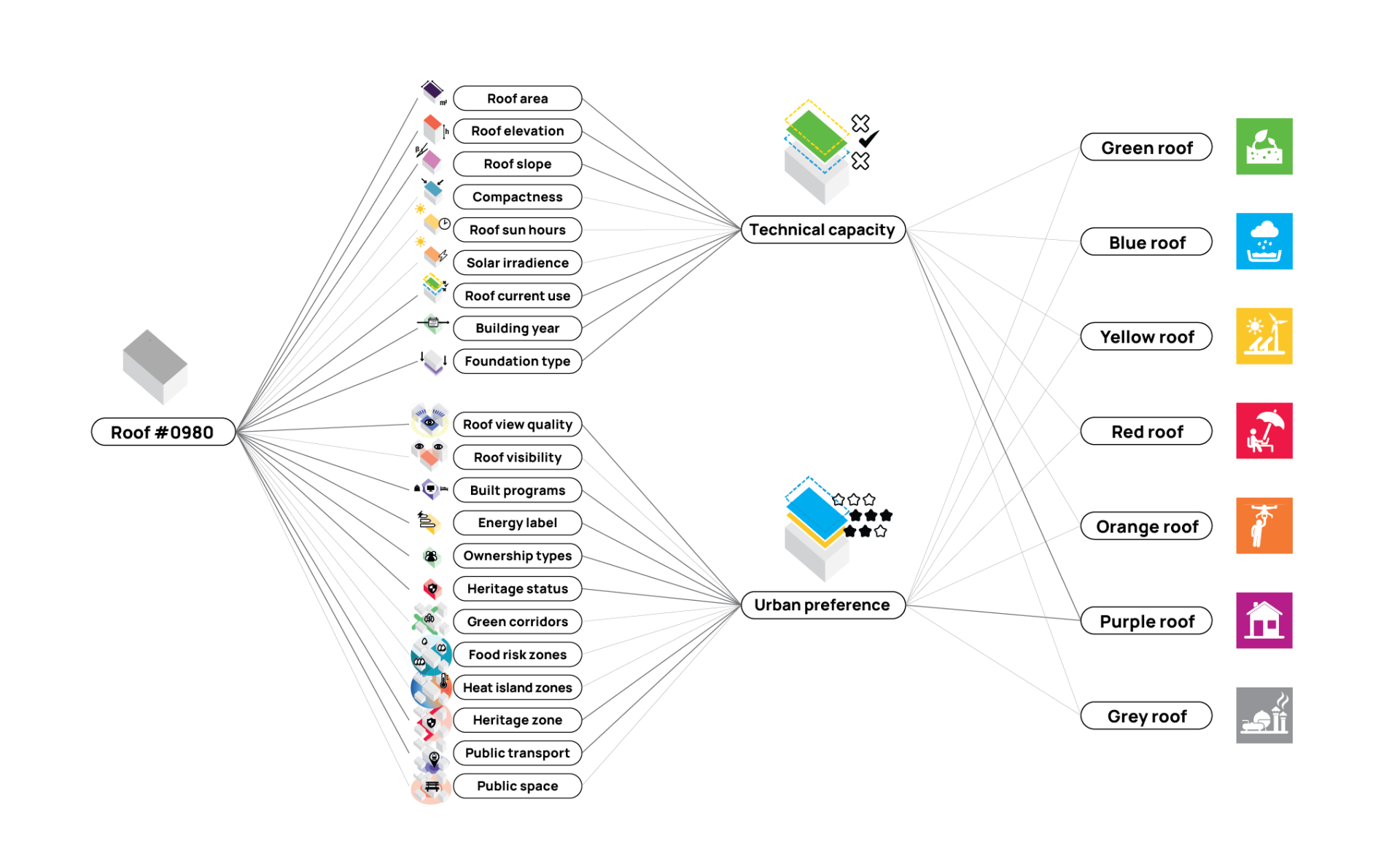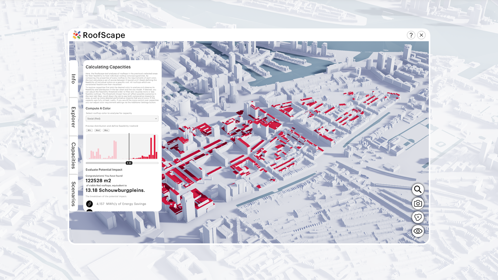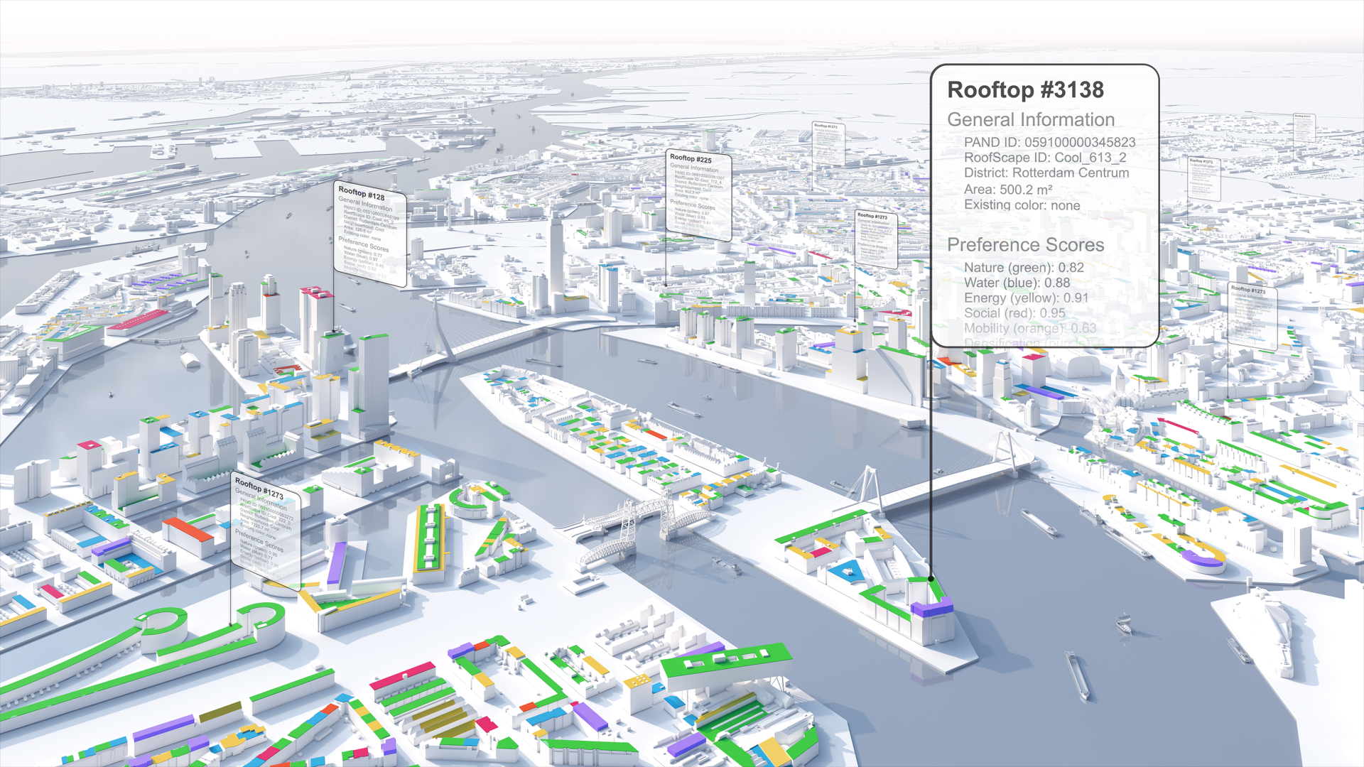 Data is collected from open-source data and linked to the digital twin of Rotterdam, which also provides the 3D model used for visualisation. Capacity analysis is carried out via a computational model that systematically evaluates individual rooftops and compares their properties with the requirements of different rooftop programmes to quantify feasibility. This is performed on the scale of the city, allowing users to explore possibilities on both a macro level and the micro level of individual buildings.