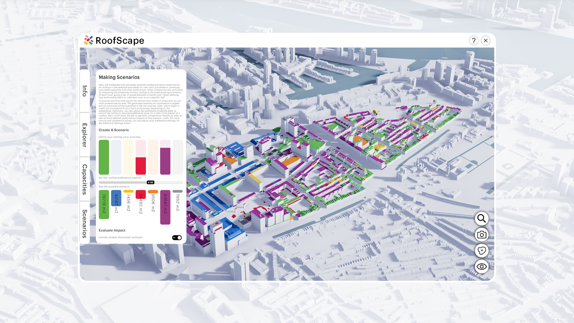 In the Scenario Builder, capacities can be linked to user-defined targets for individual programmes. Algorithms negotiate between the capacities of the rooftops and the desires of the user to help create a variety of plausible rooftop scenarios. Each scenario is visualised in the interactive 3D city model, which allows for qualitative evaluation by the user in addition to quantitative evaluation such as developable area, energy production, or water retention that is automatically provided by the tool.