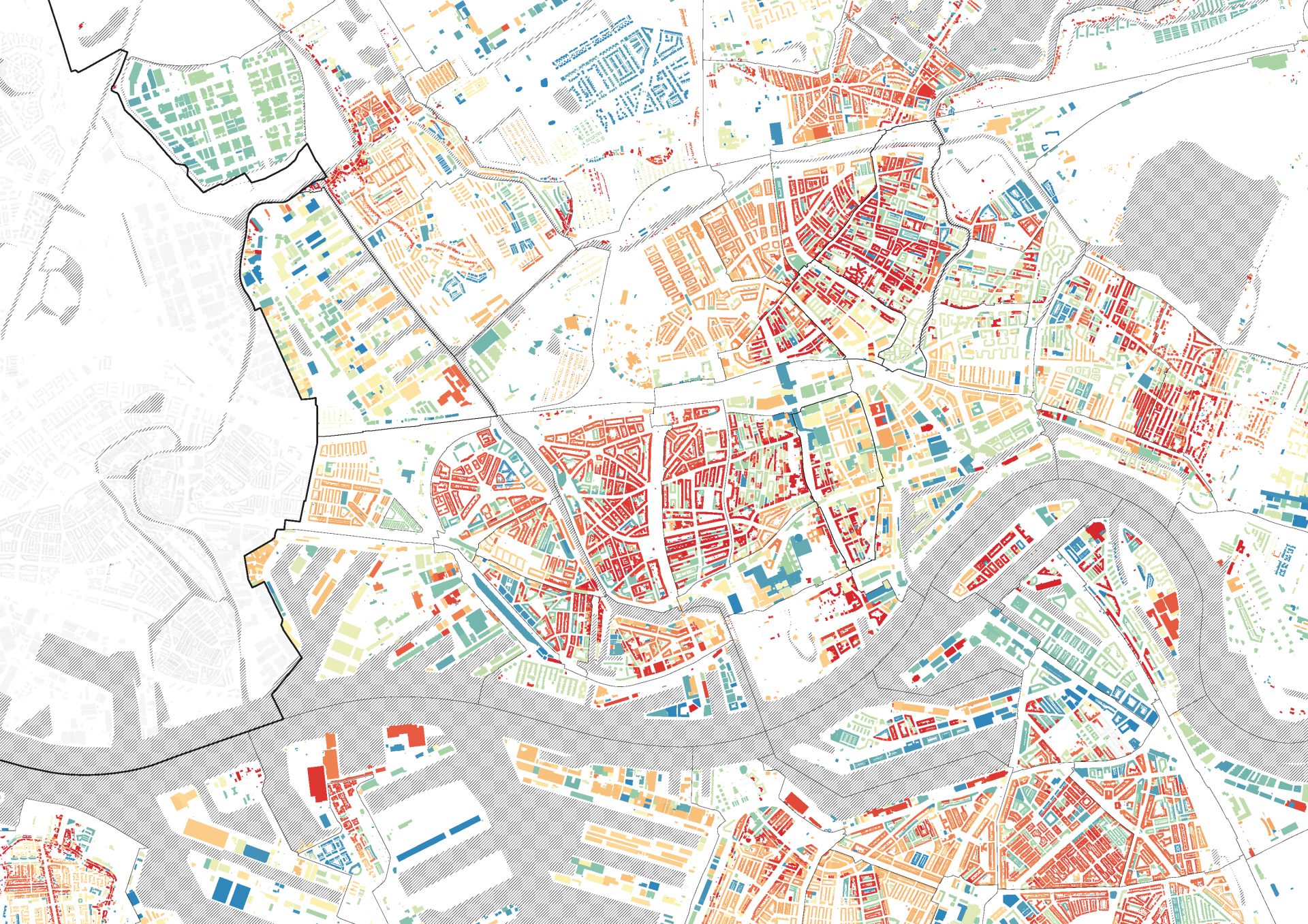 By approaching all of these questions, RoofScape is part of a larger interdisciplinary effort to intensify the city. The software builds on Rotterdam’s existing rooftop standards, such as colour-codes according to certain functions. Combining a wide range of datasets, it suggests appropriate uses for each building based on the city’s digital twin and data such as building function, age, energy label, heritage status, flood risk, and more.