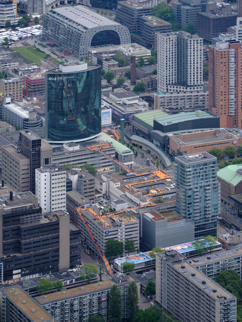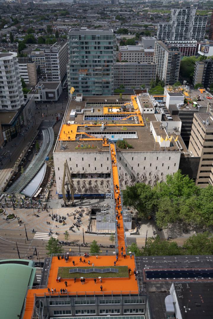 This project literally gave a new perspective to the future city. Firstly via an unavoidable eye-catcher in the city centre: a bridge connecting two buildings, high above the city’s main thoroughfare, with exterior stairways connecting the street level to the rooftops. The installation itself was a temporary architectural intervention, co-designed by Rotterdamse Dakendagen with internationally renowned firms MVRDV and LOLA Landscape Architects among others. By connecting monumental, post-war buildings de Bijenkorf and WTC Rotterdam it transformed a very well-known cityscape. The use of colour (orange) was deliberate: colour-coding to signify different forms of rooftop use is an internationally recognised practice which originated in Rotterdam. Yellow for energy generation, green for green, red for social use etc. Orange symbolises mobility: using rooftop space to create new ways to get to where you want to go. The bright colour in a concrete jungle had the added benefit of highlighting the installation, especially striking from a bird’s eye view.