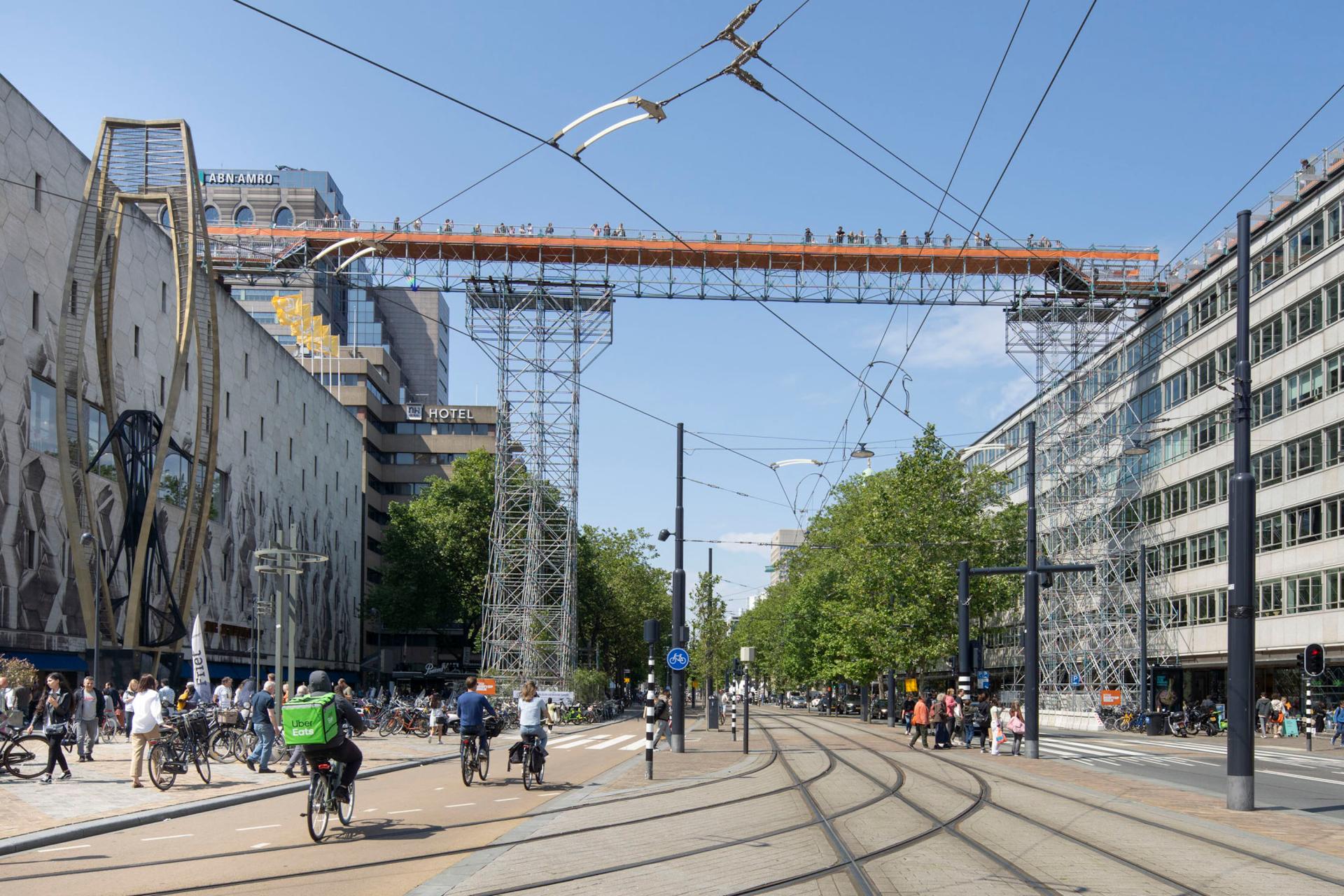 The Rotterdam Rooftop Walk was an installation consisting of stairs and bridges, connecting rooftops to the ground level via the exterior of monumental buildings in the city’s commercial district. The intent was for a large audience to experience the potential of flat rooftops as an extension of public space, providing opportunities for green spaces, recreation, cultural and artistic expression, sports, energy generation and water retention. It presented a tangible and vibrant vision of the future for densifying urban areas: the layered city. The eye-catching route featured a 60 metre bridge suspended 30 metres above Rotterdam’s main thoroughfare and was constructed with scaffolding and other reusable materials.