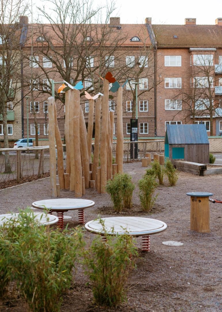 - Landscape Architect – three different colleagues were involved; one to make a plan for the trees of the park and where to add new ones. And another more involved working together with the initiator to create new flower beds and designed the playground. She has also made dialogues with children in the area to learn about their needs in terms of play. The third landscape architect is our light expert and also came up with the idea of the sound showers together with the traffic engineer.