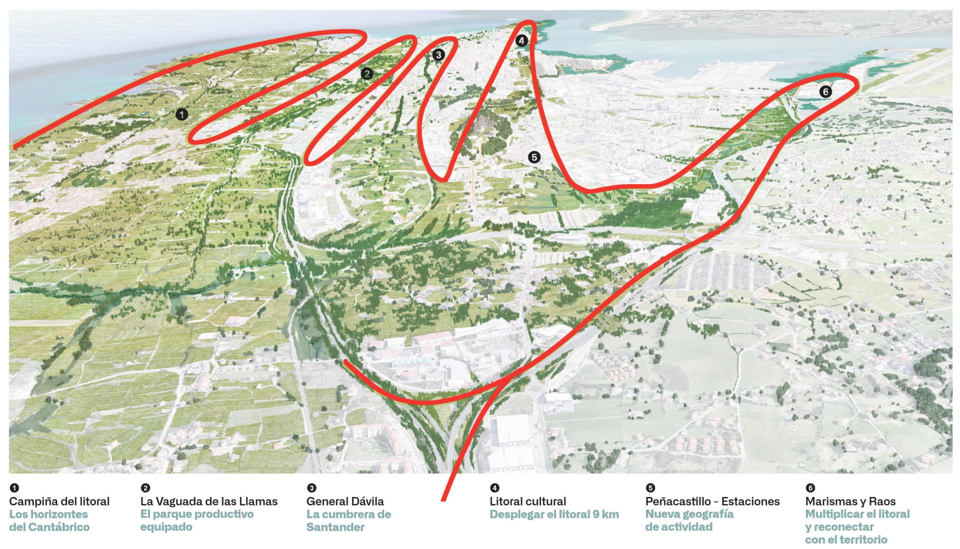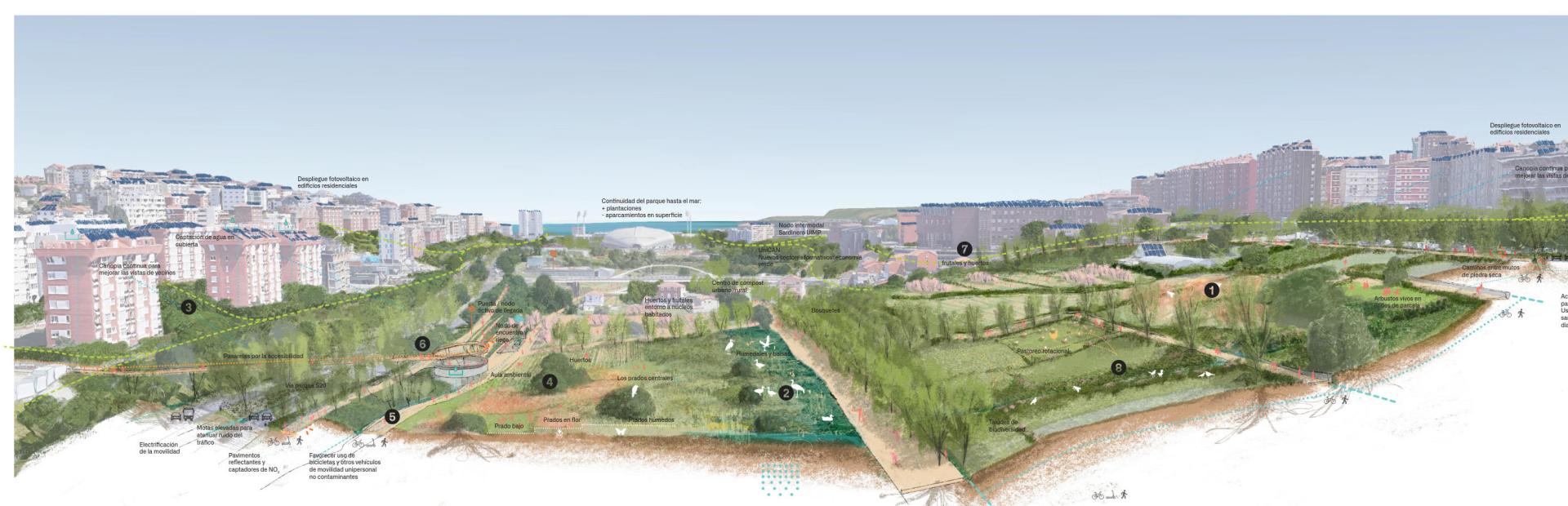 The regenerative urbanism of "Santander, Habitat Futuro" is trans-scalar and redundant, it multiplies and connects projects with common objectives from the different disciplines and scales that affect the city, in order to increase its resilience. The project is the result of the interaction of diverse disciplines: architecture, urban planning, communication, economics, mobility, energy, waste management, water management, ecology, history and even graphic design, which contribute particular studies on the geography and territory of Santander that are incorporated as part of the regeneration to move towards a circular, sustainable, resilient, vertebrate, prosperous, vital and inclusive city.