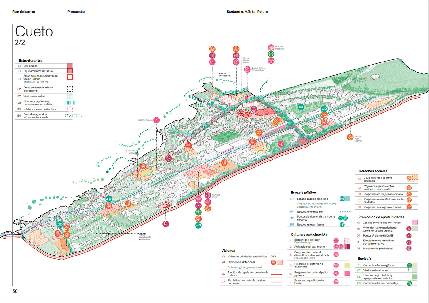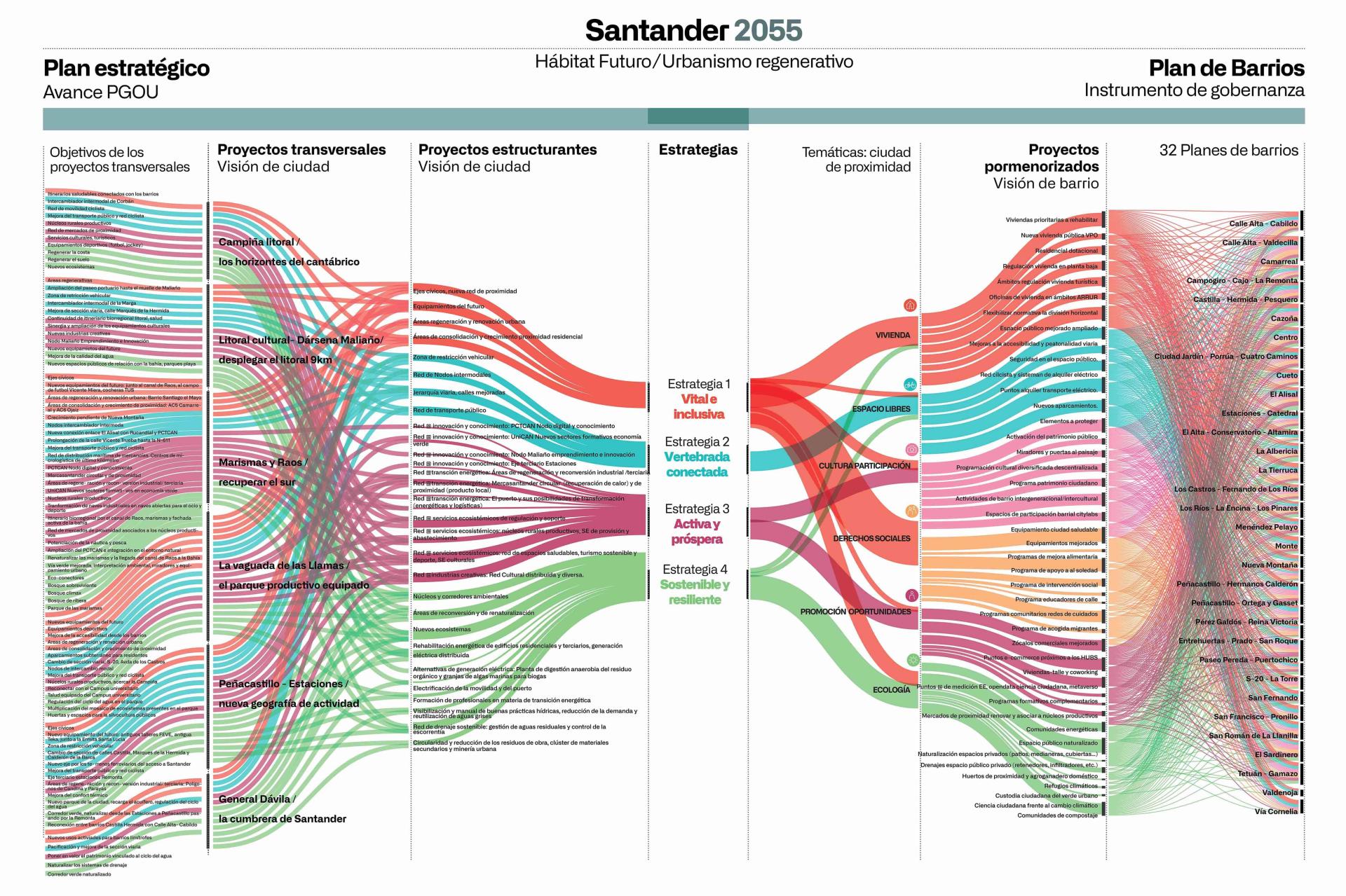 "Santander, Habitat Futuro" is based on a thorough analysis of the conditions of the territory, its needs and opportunities, which is articulated through four strategies to improve the city, six cross-cutting projects and 32 neighborhood plans. It is an open model, based on regenerative urbanism, which, based on innovation and citizen participation, prepares and adapts the territory and its ecological, economic and social conditions for the different scenarios to come.