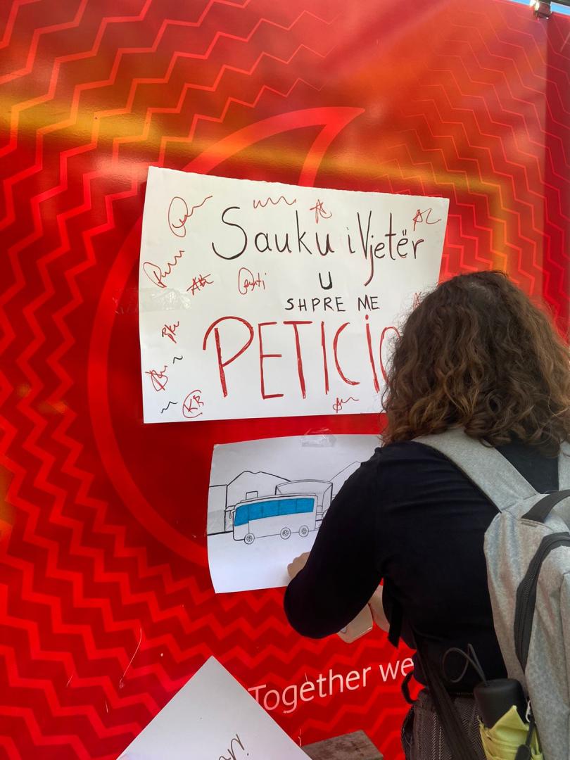 Finally, when the petition and survey received a delayed response from the multiplicity of Tirana and AMK, a small art protest was organized in which volunteers created posters and, together with residents and activists, posted them at the bus station in a sign of demonstration.