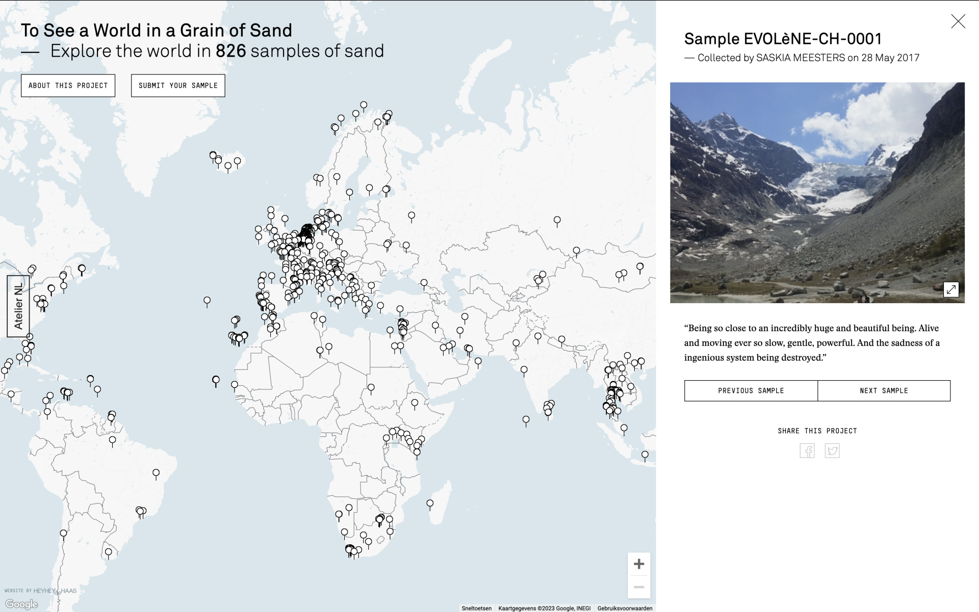 To See a World in a Grain of Sand is a project that maps the earth through small sand samples contributed by people worldwide, in combination with their personal stories attached to the place where the sand was found. Atelier NL fuses these ‘wild’ sands into glass specimens reflecting local geological diversity, which they show along with the original samples and the stories. All contributions are also mapped on aworldofsand.com. Together they constitute a rich and beautiful survey of sands, glass and memories. At the same time, they reveal the complex ecological and geopolitical issues at stake. It is truly our world, reflected in a grain of sand.