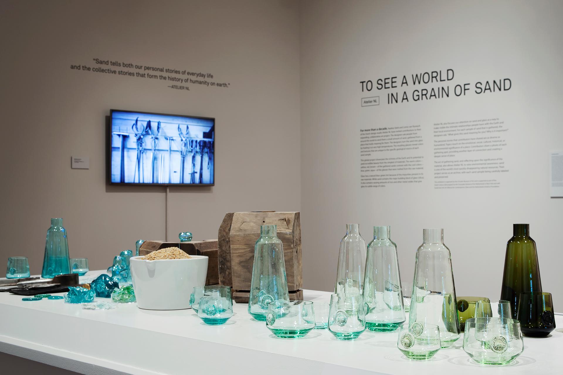 Apart from awareness, the project also aims to demonstrate how the obsession with ‘pure’ materials (to meet the demands of efficiency and industrial standards), completely alienates us from valuable local diversity, the quirks and deviations that add character to locally produced items. Thanks to extensive research and experimentation, Atelier NL has shown that it is possible to make glass from nearly any type of ‘wild’ sand, maintaining and highlighting their particular qualities. On a small scale, it defies the industry by creating beautiful drinking sets from local glass. Much of the technical ceramic knowhow that goes into their production has been gained by creating the glass samples that are presented in To See a World in a Grain of Sand.
