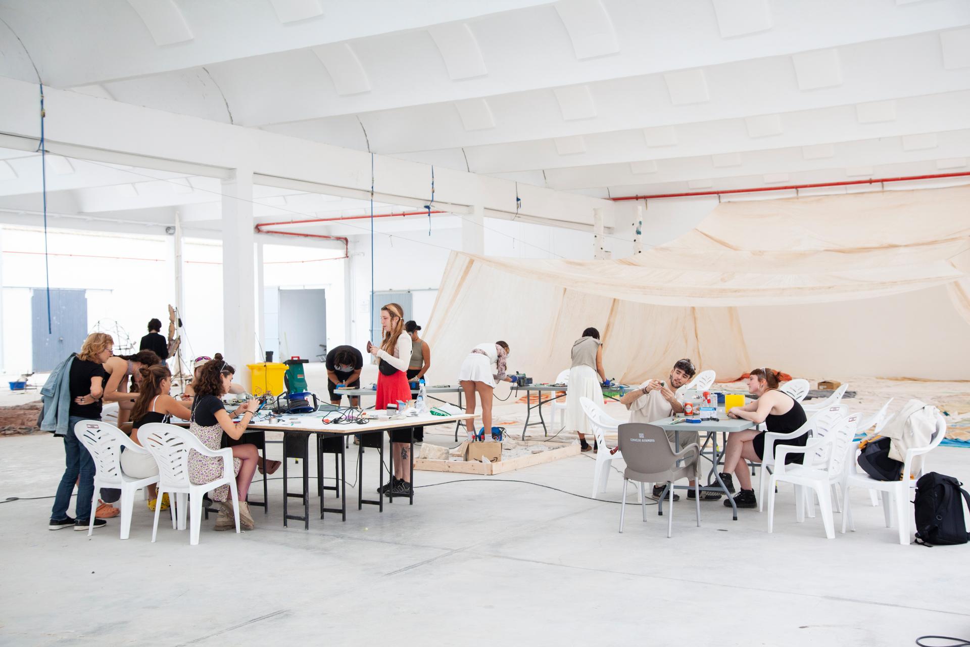Ficciones Compartidas involved the development of installations based on traditional techniques and skills integrated in a novel and unexpected way in a new production context: the Las Cigarreras cultural centre. We inherited techniques from traditional crafts from Alicante (basketry, pottery, jewellery...) which we implemented in the installations, revising and hacking them. This was done through direct contact with those professionals who taught us their knowledge. Thus, by implementing the techniques of these trades in architecture, we obtain an interdisciplinary crossover that benefits, on the one hand, the design of the installations and ensures, on the other hand, the circulation of knowledge and the survival of those industries that are exposed to disappearance.