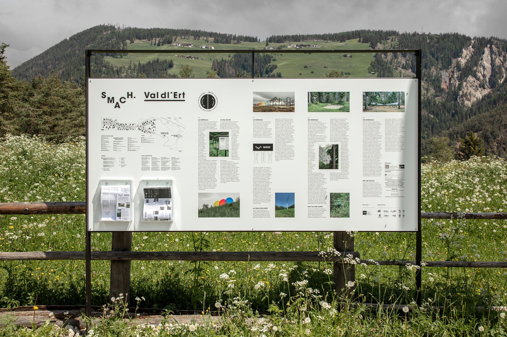 SMACH brought public art to San Martin and Val Badia, and through it we created wellbeing. In 2020 the WHO - World Health Organisation conducted the research "What is the evidence on the role of the arts in improving health and well-being?". It highlighted the link between the fruition of art and health saying that “artistic activities, due to their complex and multimodal nature, are capable of combining several different components, all known to be healthy". This was particularly clear during the various periods of restrictions on people's freedom of movement. While it is true that, before the Covid, the Val dl'Ert was frequented more by tourists than by locals who thought “Well, rather than walking in the woods behind my place I'll take the car and go higher up”, then during and after the pandemic the art vallery was finally experienced as a great resource and still is today. The aesthetic aspects are provided by the care taken by SMACH, the participating artists and the jury, both in the creation process and in the selection and realisation of the artworks. Besides, the explanatory panels, the signage system, the small library of volumes on Ladin culture, is under the banner of giving attention to the coordinated image of the project and its usability.