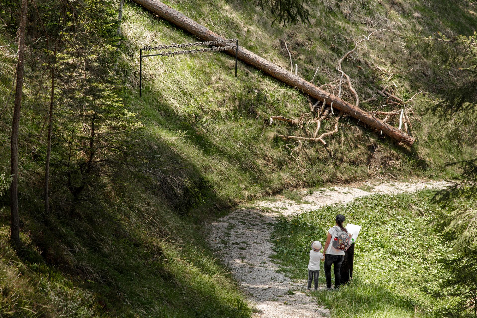 Val dl'Ert was born in this complex context with the desire to bring the community closer to its heritage and to nature through contemporary art. The 23 artworks exhibited in Art Valley are donations, acquisitions or long-term loans from the artists who previously participated to SMACH Biennale. The installations - created and set up in nature in accordance with the DNSH principles and in agreement with the landscape protection offices of the Province - dialogue with the naturalistic, historycal, cultural, linguistic and social peculiarities of the territory. Art is the means of conveying metaphorical meanings on current issues such as globalisation, climate change, social-econmical inequalities, but also proposing knowledge of the place.