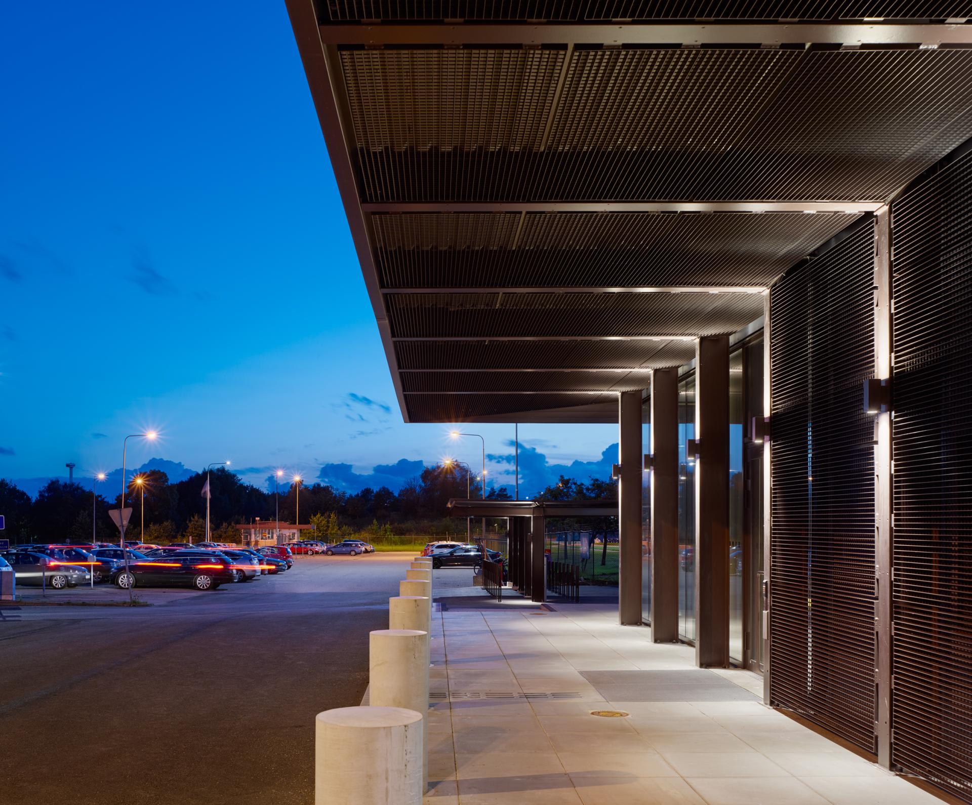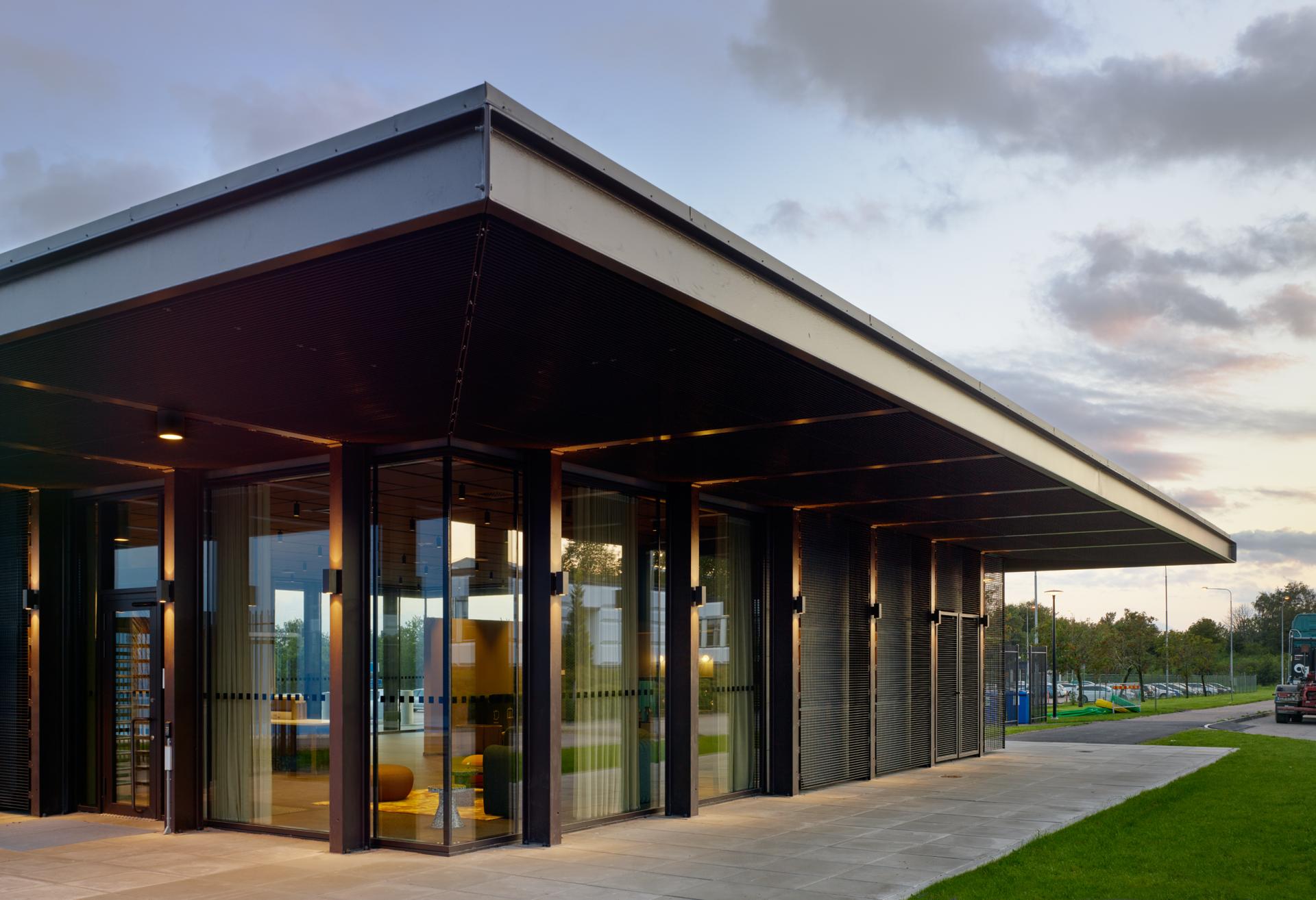 The design of the entrance building takes its inspiration from typical industrial architecture: the industrial hall with its large spans, the visible external structure, honest materials, beams, and grid decking. In contrast to the rugged industrial expression, the 3.5-meter high frameless glass partitions stand out, giving the building its unique character — an equal blend of rough industrial structure and a high-tech visitor pavilion.