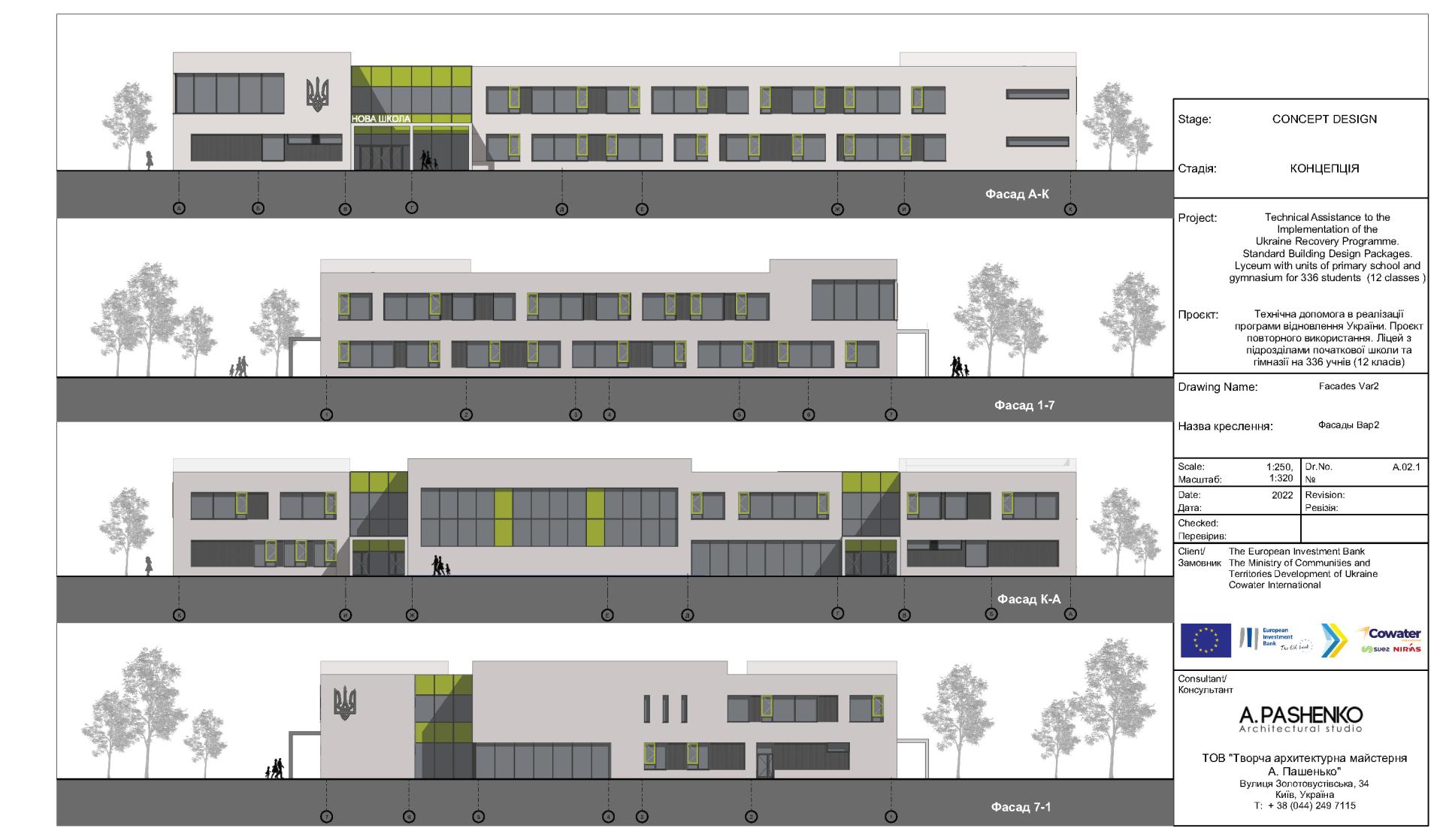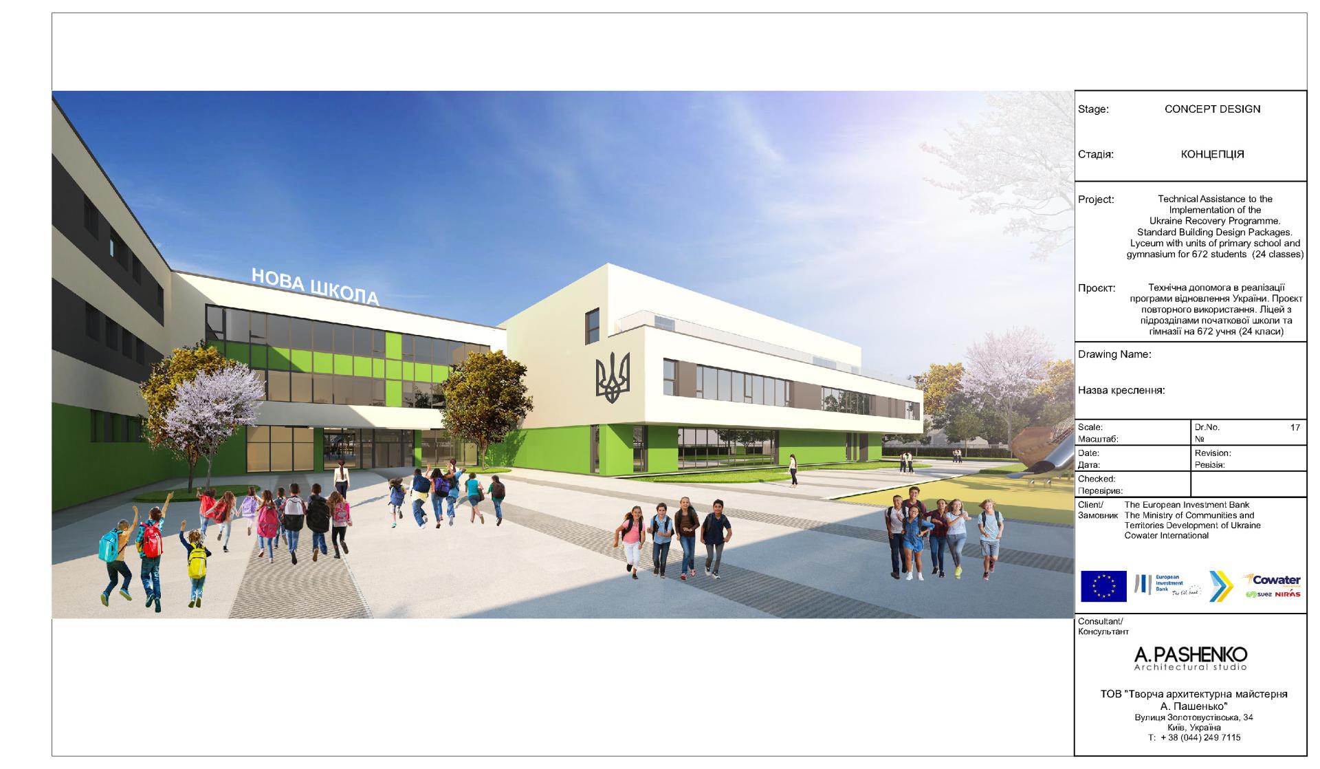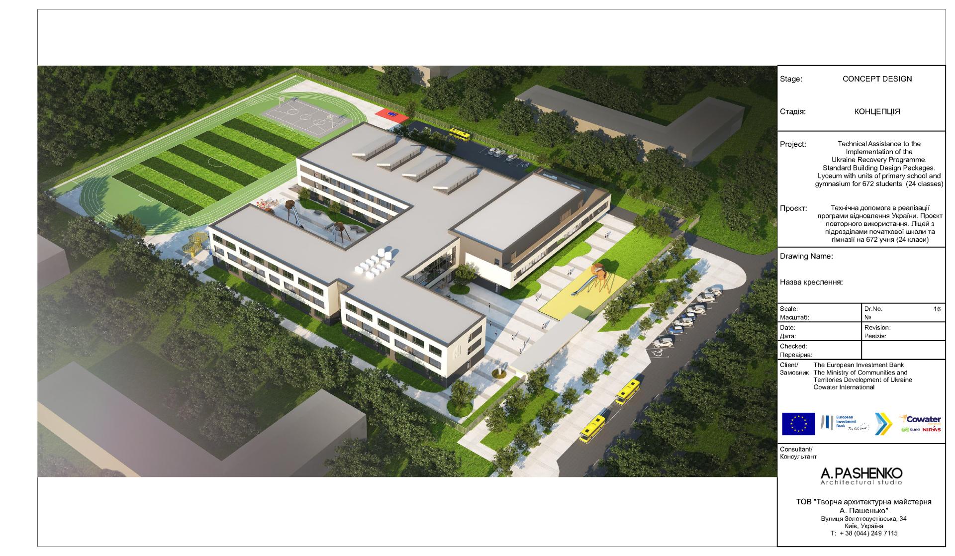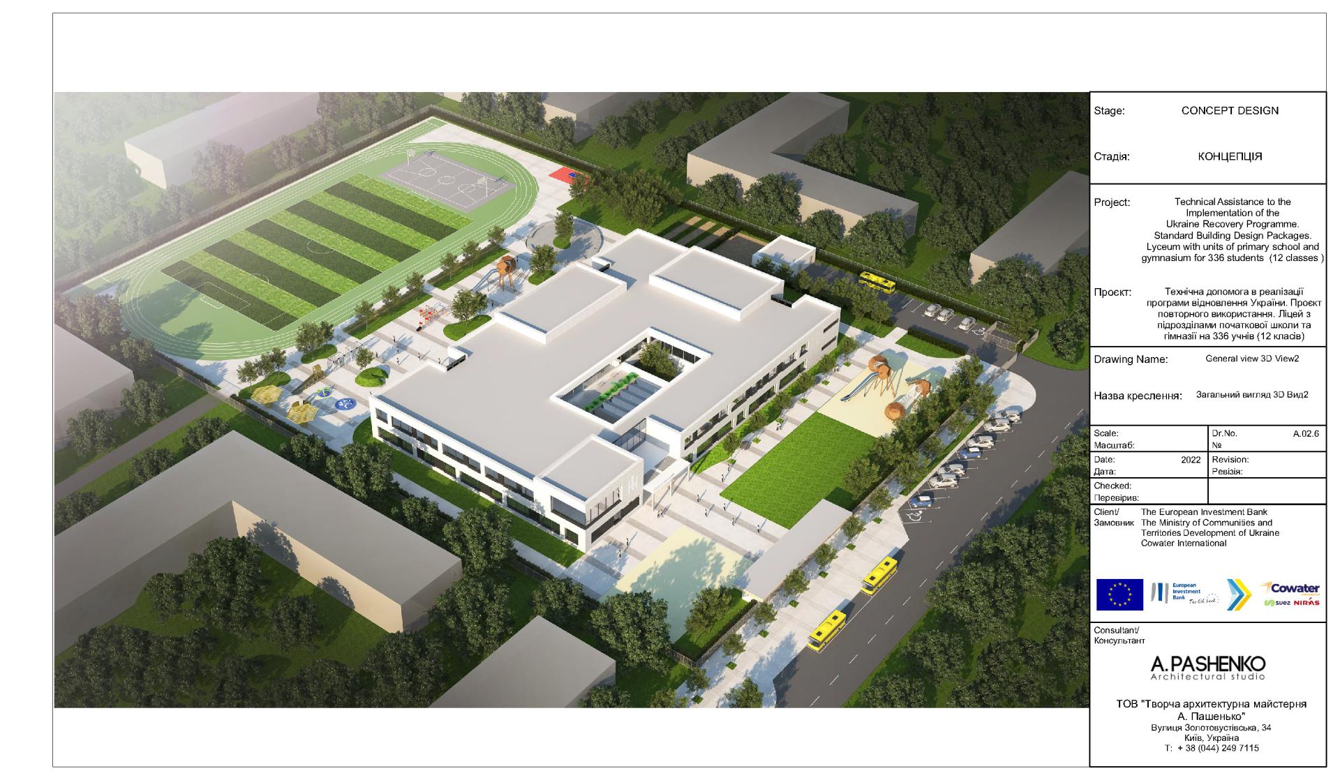The Ukrainian Architectural Studio A.PASHENKO have developed seven typical projects of social infrastructure for the rebuilding of Ukraine. The project was implemented within the framework of the Ukraine Recovery Program (URP) — a framework loan from the European Investment Bank (EIB). The projects include three schools, three kindergartens and an administrative services centre, and can be used by local municipalities for free, saving considerably time and money in the reconstruction efforts.